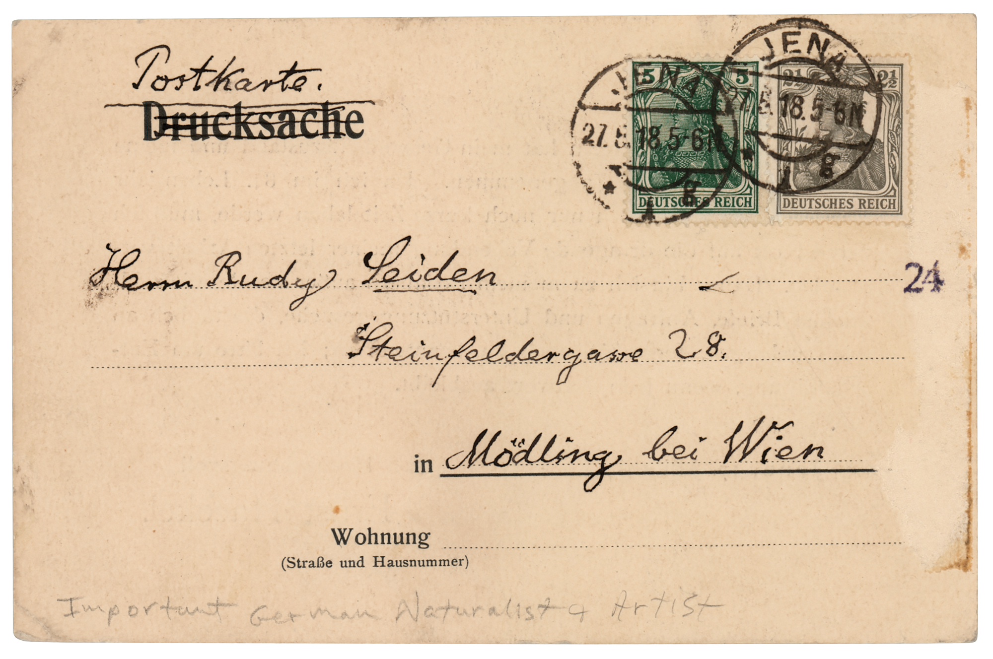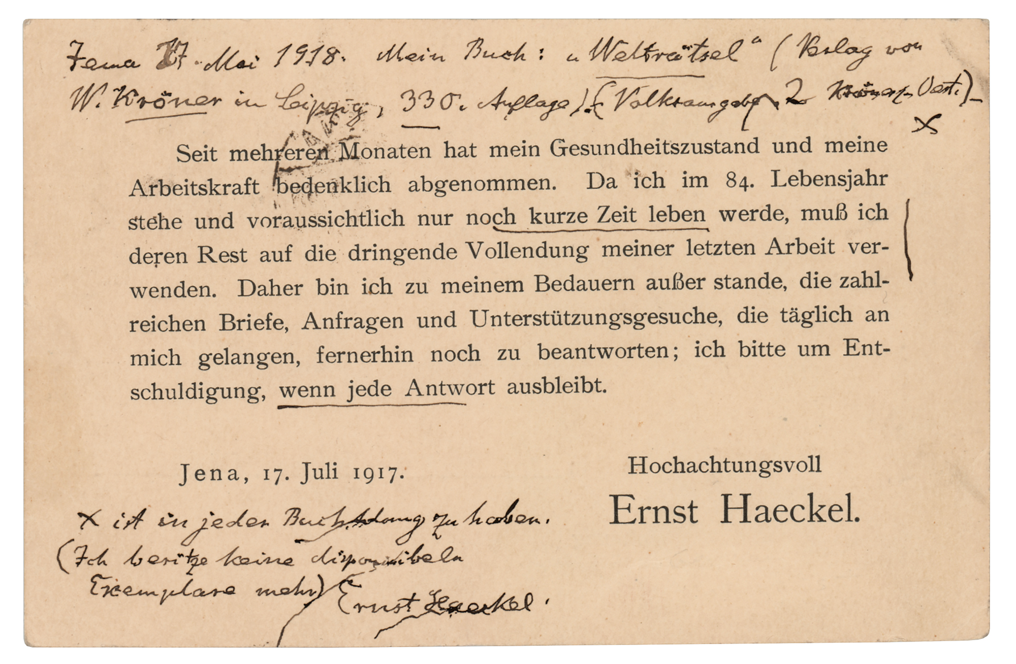 Influential German evolutionist, morphologist, and developmental biologist (1834-1919) remembered as a supporter and exponent of Charles Darwin's theories. ANS in German, signed “Ernst Haeckel,” one page, 5.5 x 3.75, July 17, 1917. Untranslated handwritten note on a form letter postcard, sent as a response to letters he received. The printed text, in part (translated): "For several months my health and my ability to work have declined significantly. Since I am now 84 years old and will probably only live for a short time, I must use the rest of my life to urgently complete my final work. Therefore, to my regret, I am no longer able to answer the numerous letters, inquiries and requests for support that I receive every day; I apologize if there is no answer." In fine condition.