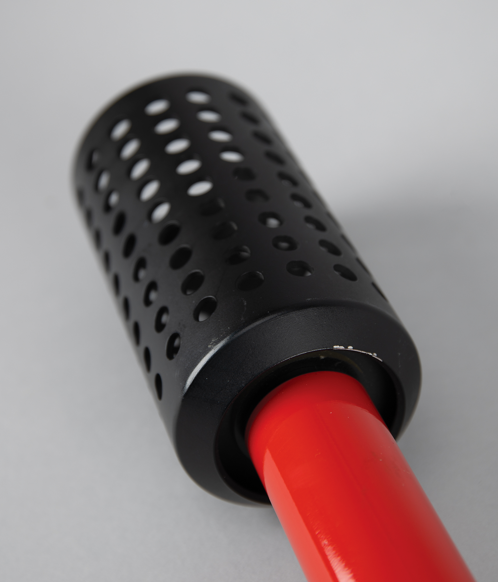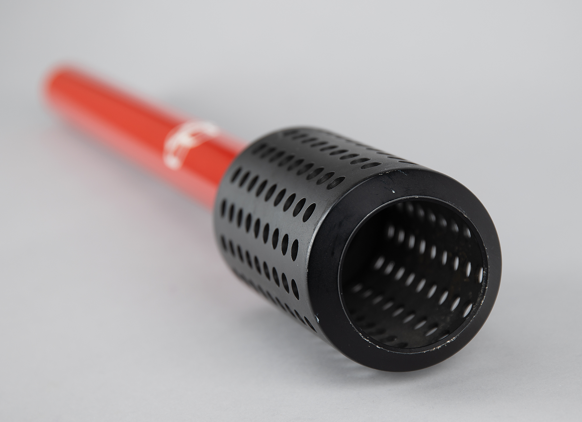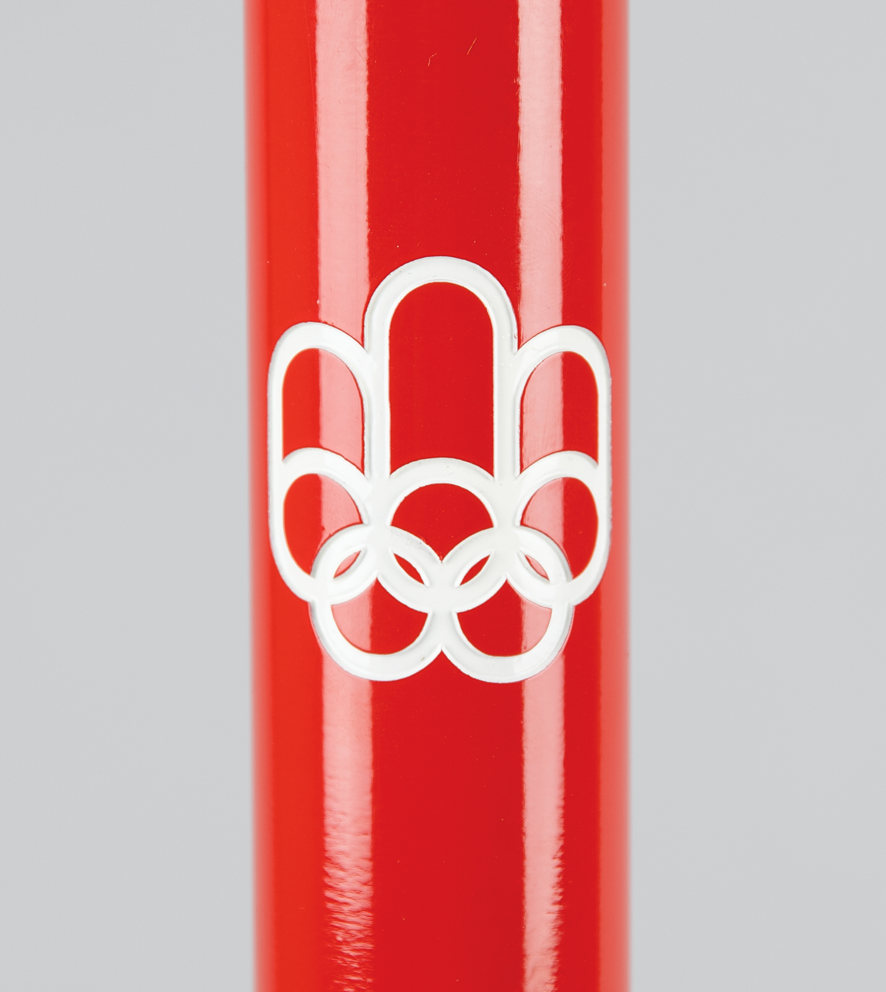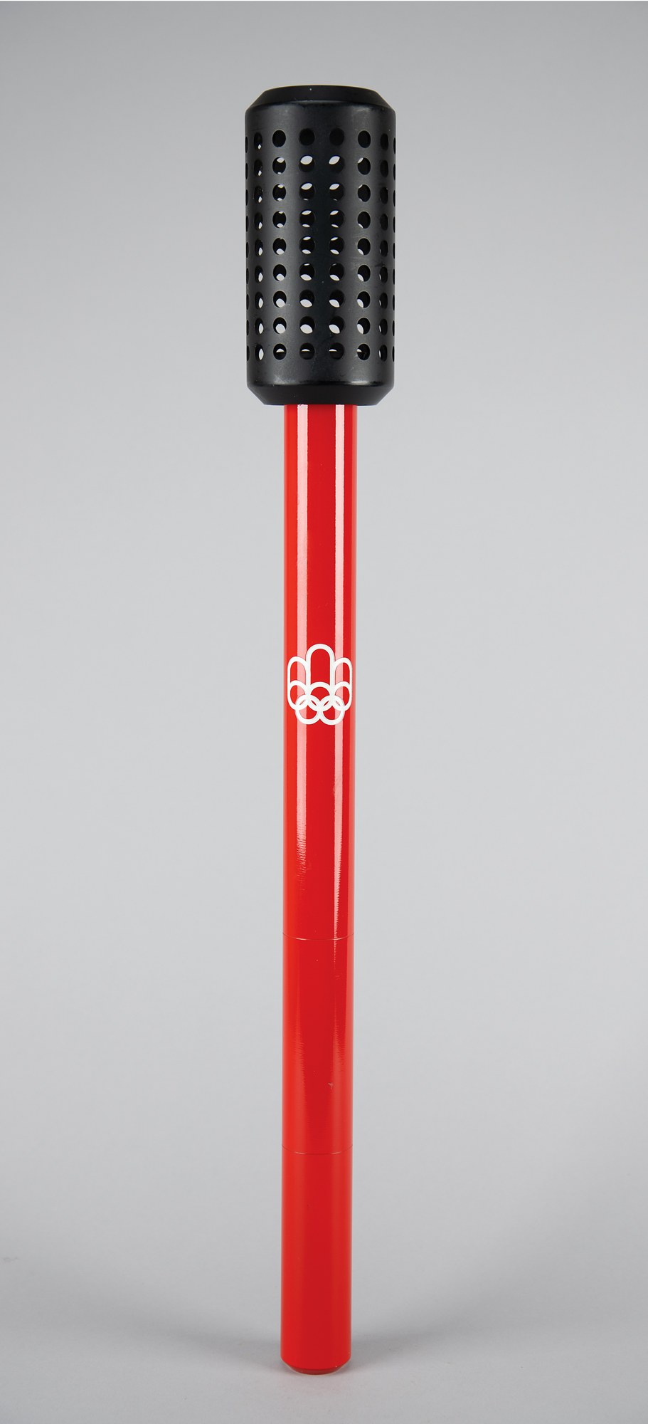Iconic official 1976 Montreal Olympics torch, comprised of aluminum, measuring 26″ in length and 3″ at its widest point, designed by Georges Huel and Michel Daillaire. The simple yet distinct torch consists of a red handle emblazoned with the Montreal Olympics emblem, and a black 'basket' to carry the flame; the black color on top was intended to make the flame stand out. Exhibits a couple trivial scratches to the black basket. About 1,200 torchbearers participated in the relay, which lasted just four days from July 13 to July 17 and covered 775 km.