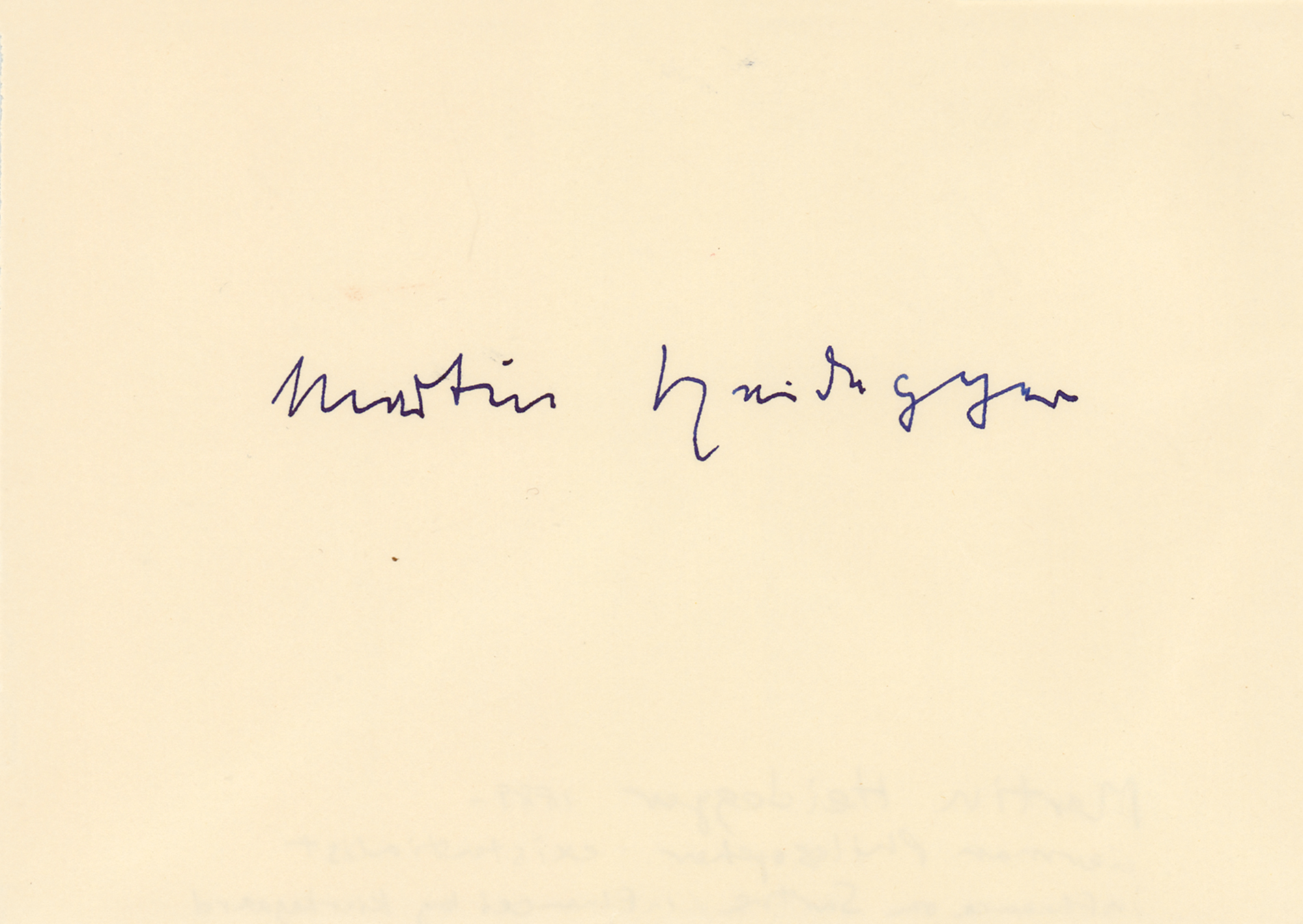 German philosopher (1889-1976) known for his contributions to phenomenology, hermeneutics, and existentialism. Fountain pen signature, "Martin Heidegger,” on an off-white 5.75 x 4 slip. In fine condition, with a light bend to the lower right edge. Accompanied by the original mailing envelope.