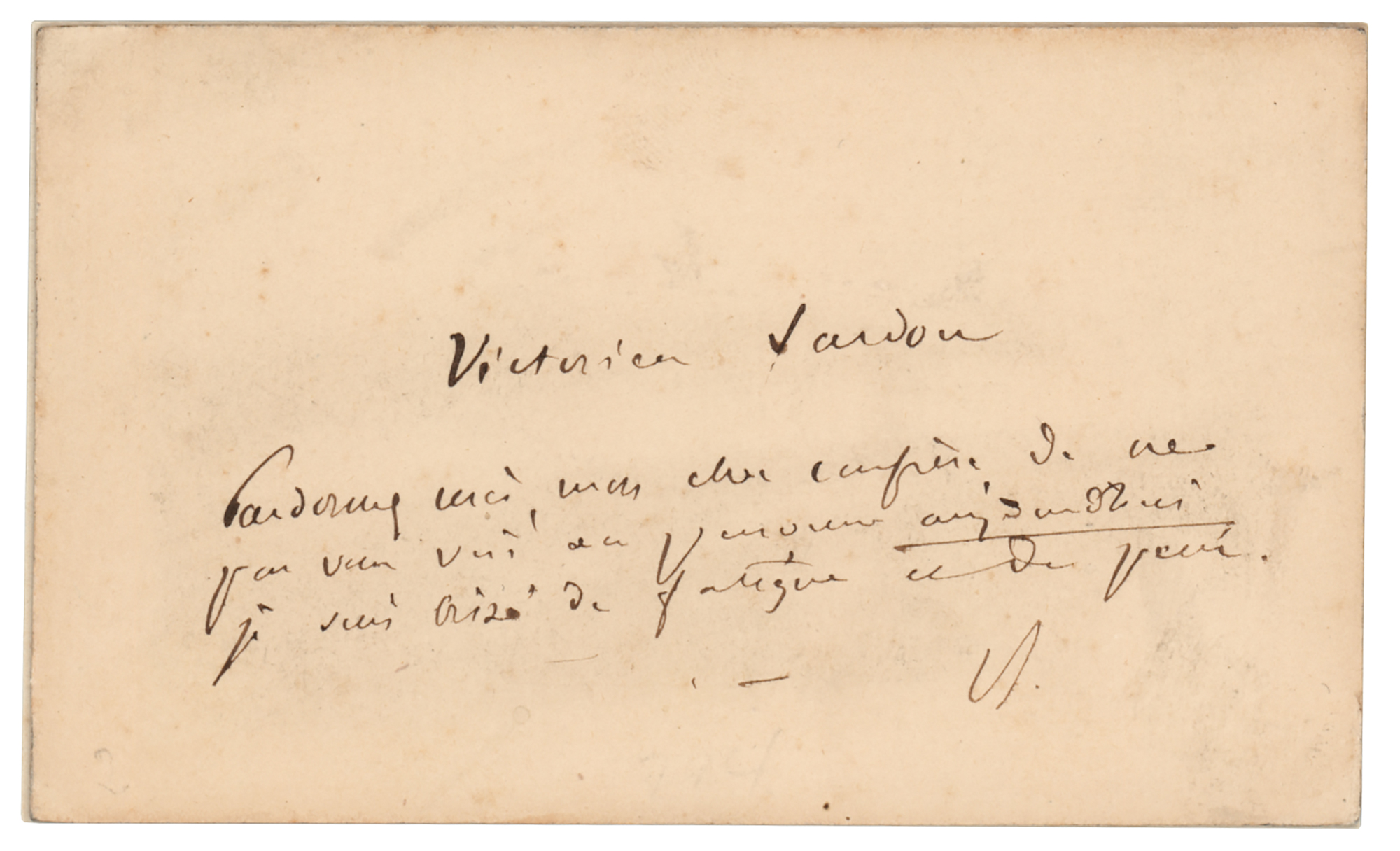French dramatist (1831-1908) who wrote several plays that were made into popular 19th-century operas such as La Tosca. ANS in French, signed "Victorien Sardou" and "V.S.," on an off-white 3.75 x 2.25 card, no date. Brief untranslated handwritten note by Sardou. In fine condition.
