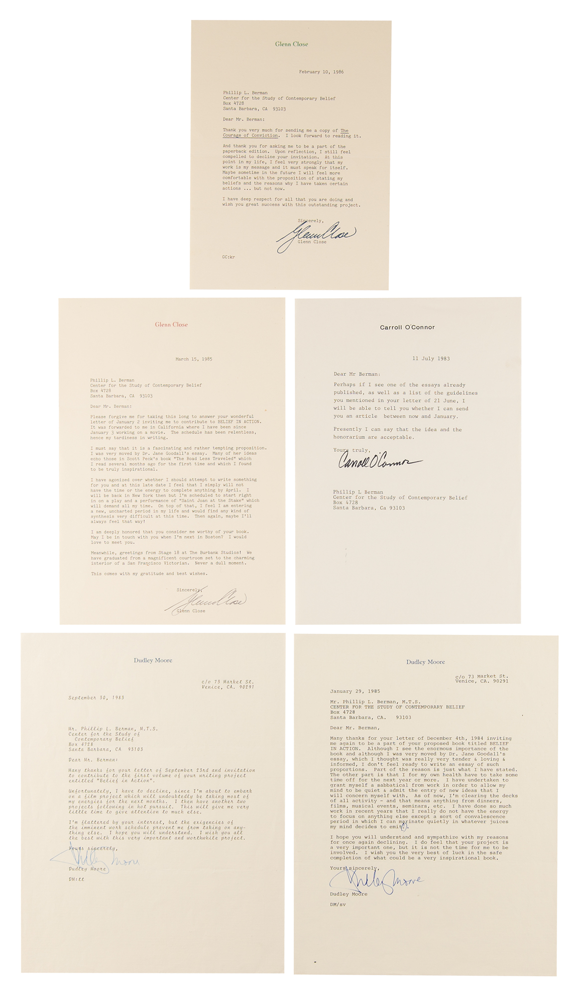 Five TLSs by award-winning entertainers, each one page, dated from 1983 to 1986. All are to Phillip L. Berman of the Center for the Study of Contemporary Belief, responding to invitations to contribute to a writing project called 'Belief in Action.' Includes: Glenn Close (2), Dudley Moore (2), and Carroll O'Connor (1). In overall fine to very fine condition.