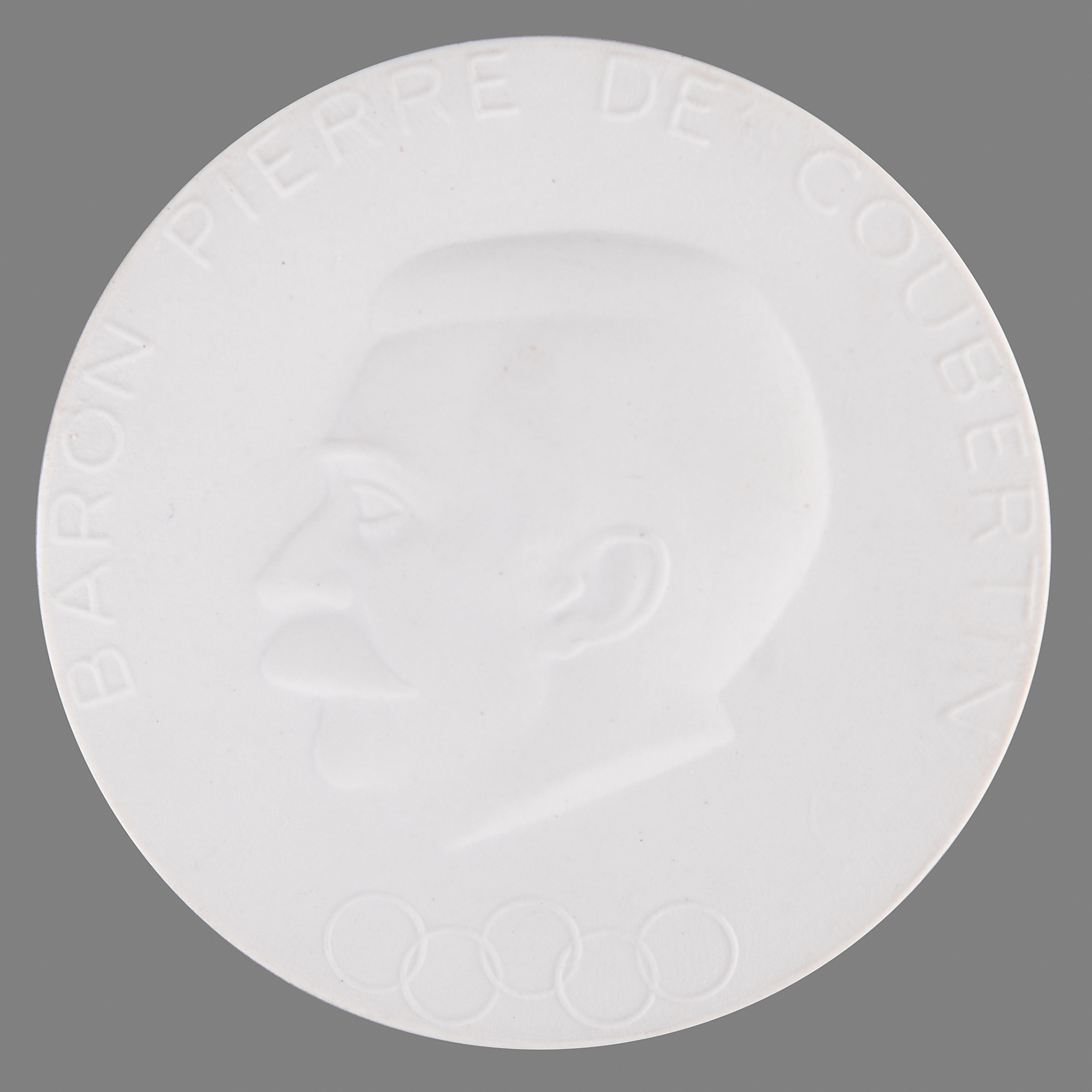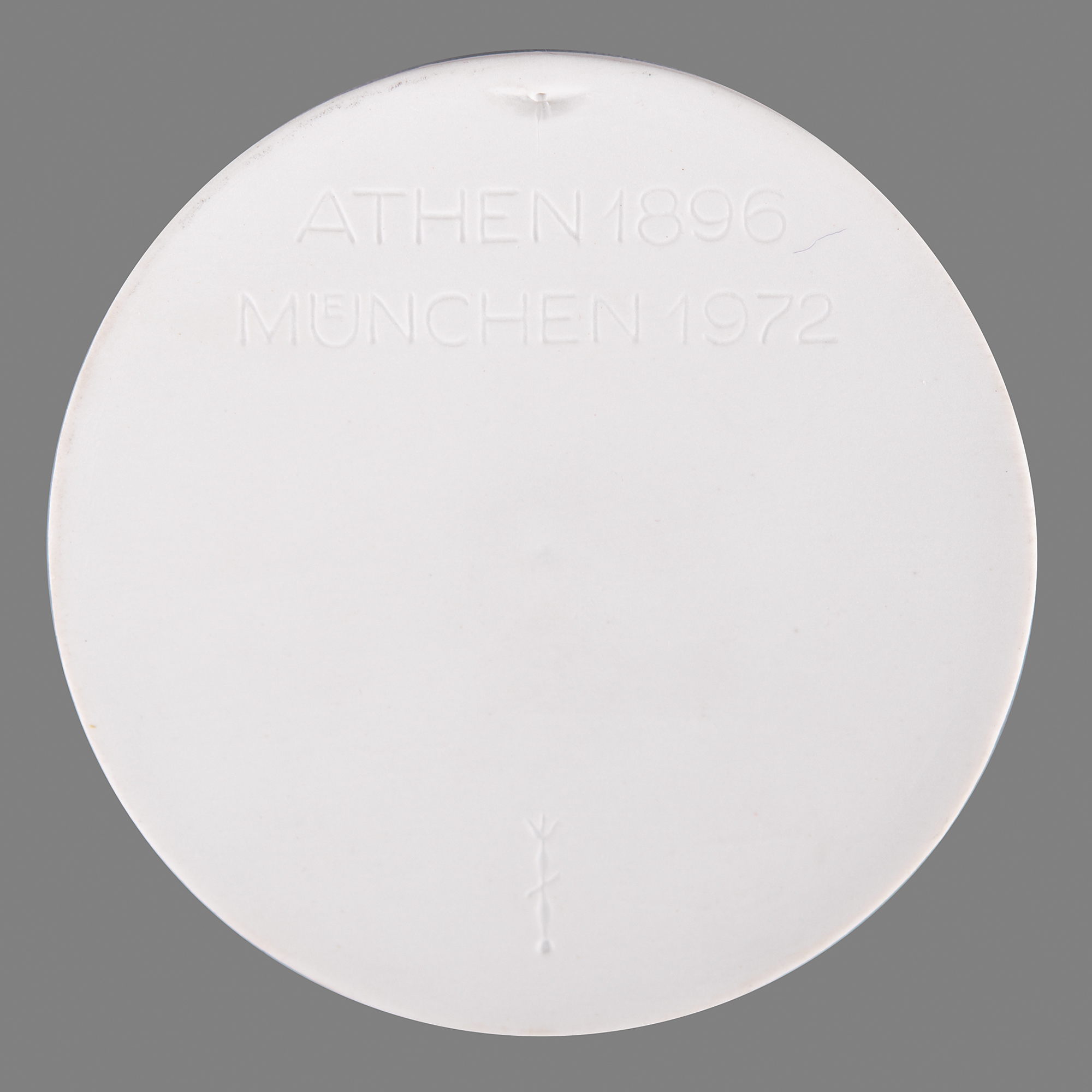 Porcelain medallion issued for the Munich 1972 Summer Olympics. Made by Meissen, 76 mm, 62 gm, with the front featuring an embossed profile of IOC co-founder Pierre de Coubertin with Olympic rings and raised name text, and the reverse engraved “Athen 1896, Munchen 1972,” above the maker mark.
