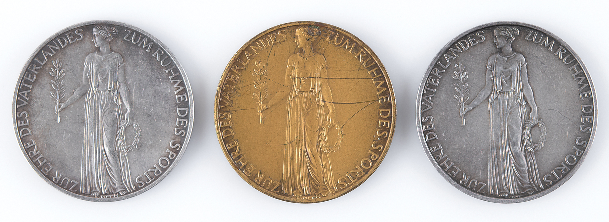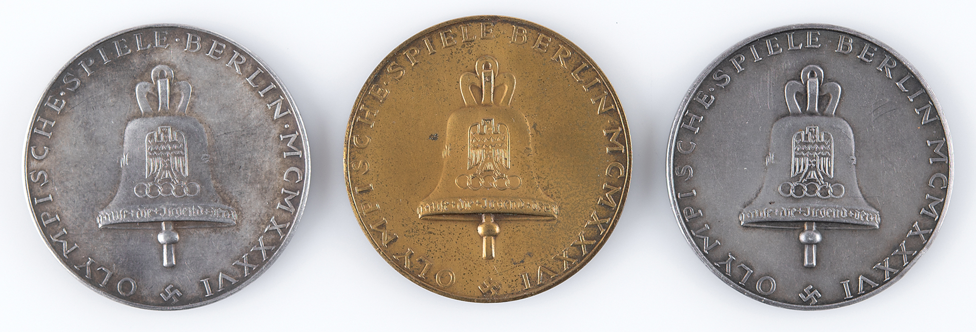 Set of three commemorative medals issued for the Berlin 1936 Summer Olympics, including a bronze-tone medal (21 gm) and two silver-tone medals (both 22 gm), which all measure 38 mm in diameter. The medals share the same designs: the front depicts the goddess Athena in the center surrounded by raised text (translated) “In honor of the fatherland, for the glory of the sport”; and the reverse features the Olympic bell embossed with the German eagle gripping the Olympic rings, with the border inscribed, “Olympische Spiele Berlin MCMXXXVI,” and a small swastika at the bottom center. The edges bear the maker marks.