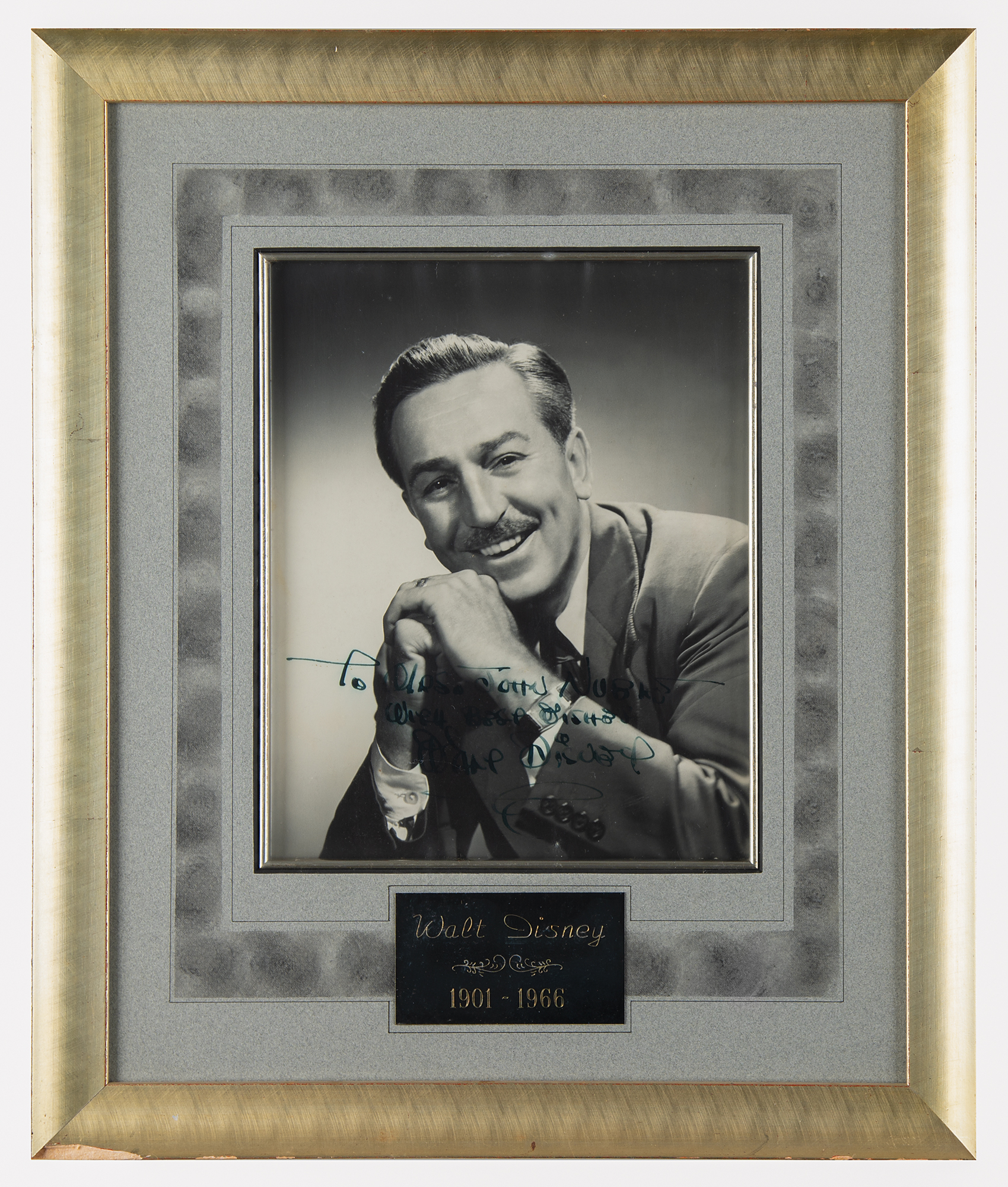 Vintage matte-finish 7.5 x 9.25 photo of the smiling animation icon, nicely signed and inscribed in fountain pen, "To Mrs. John Noble, with best wishes, Walt Disney.” Nicely matted and framed with a plaque to an overall size of 14.25 x 17. In fine condition, with light rippling along the top edge.