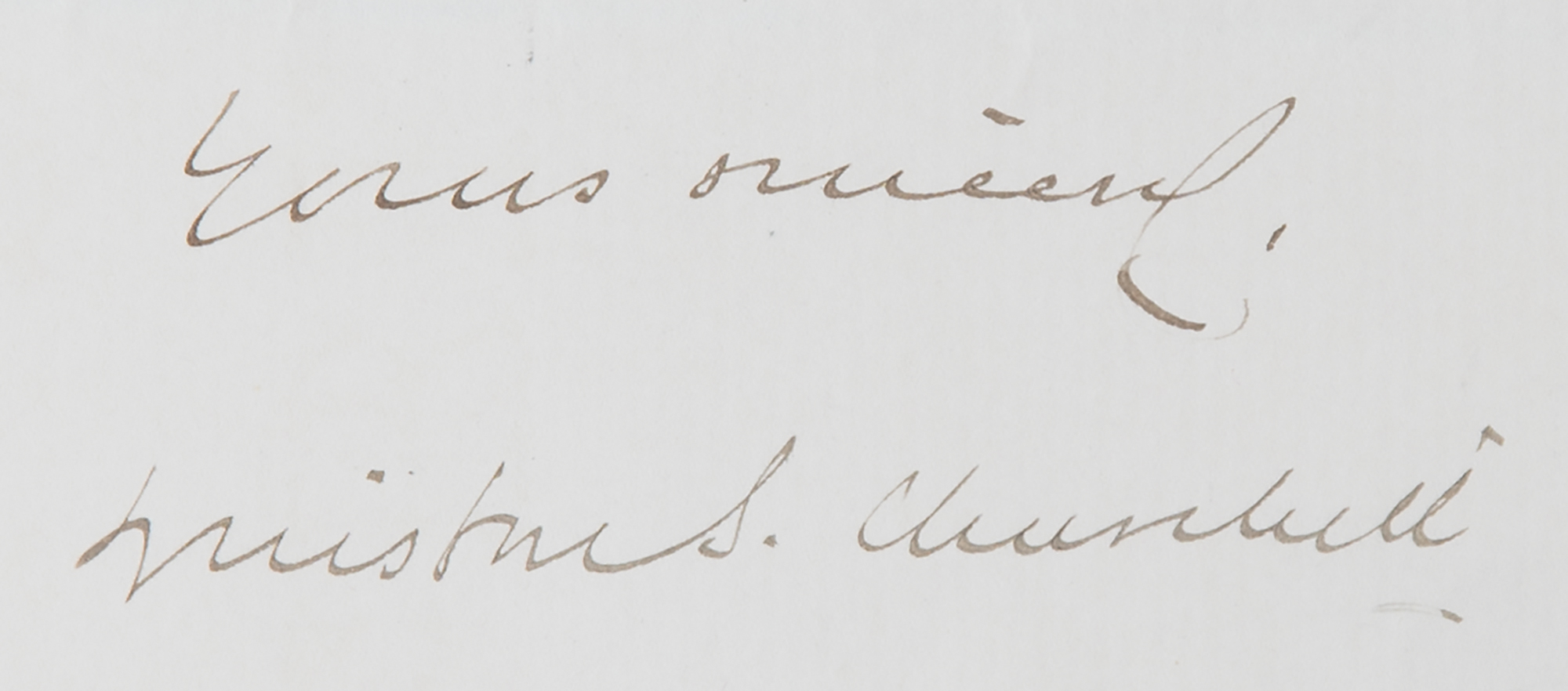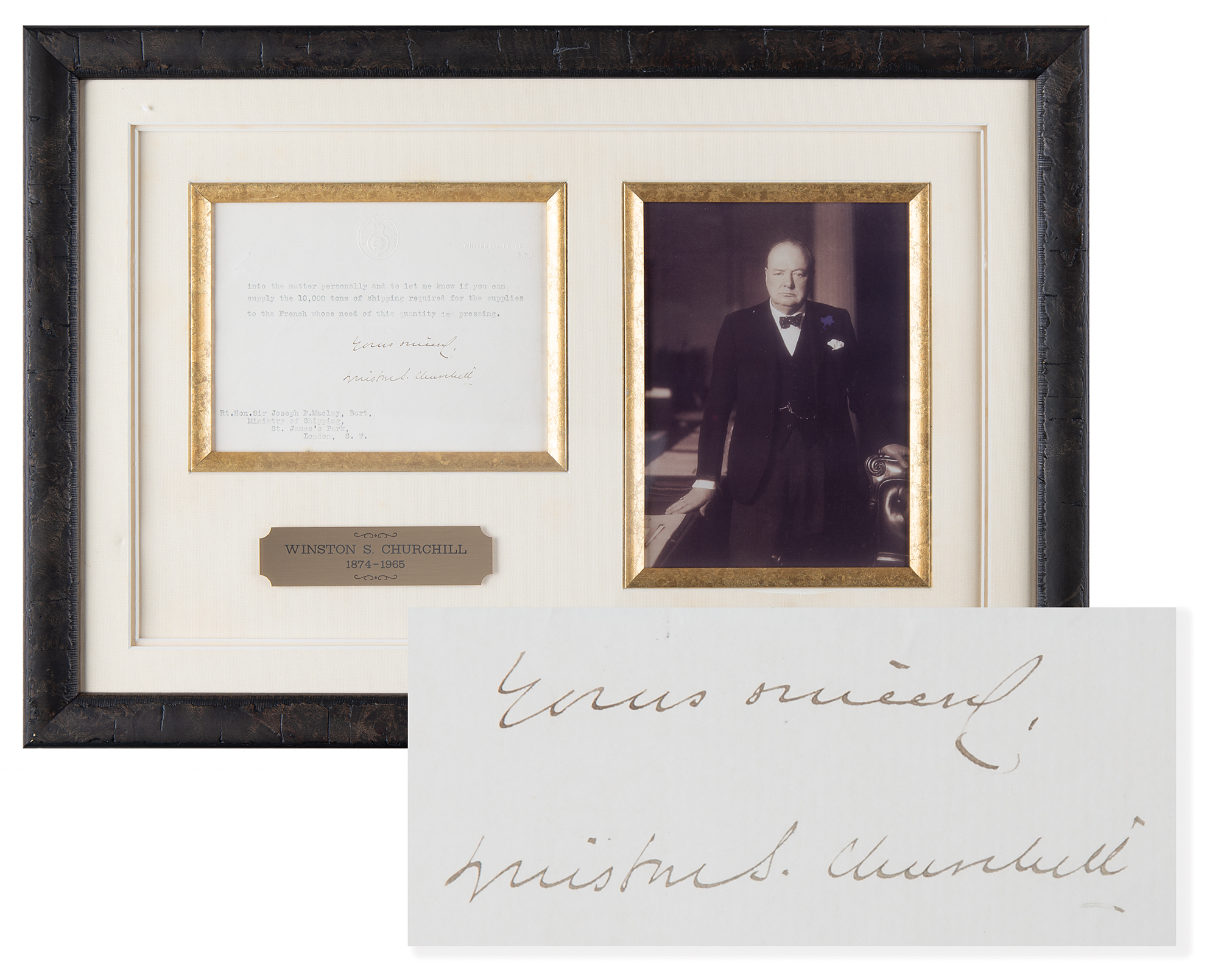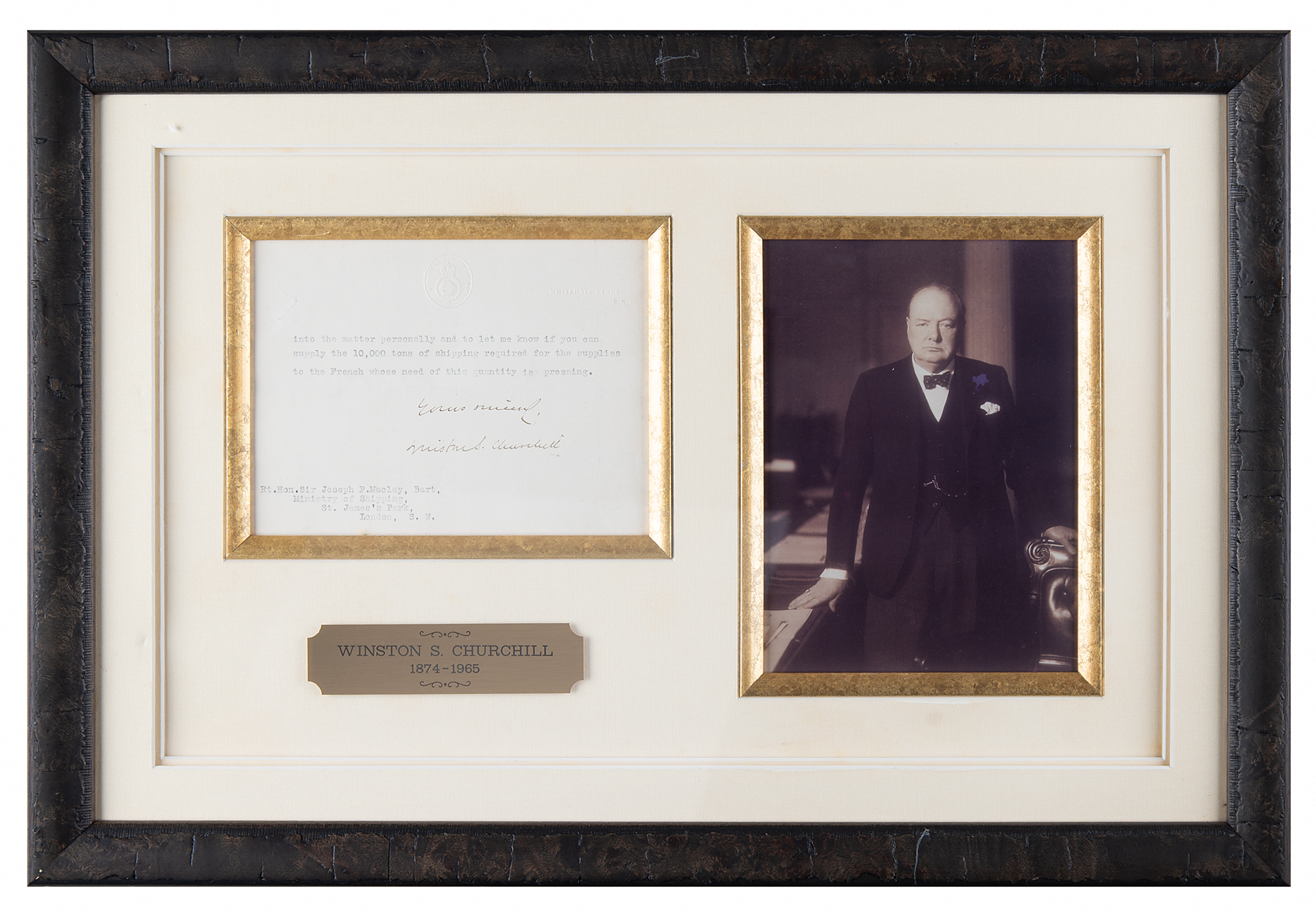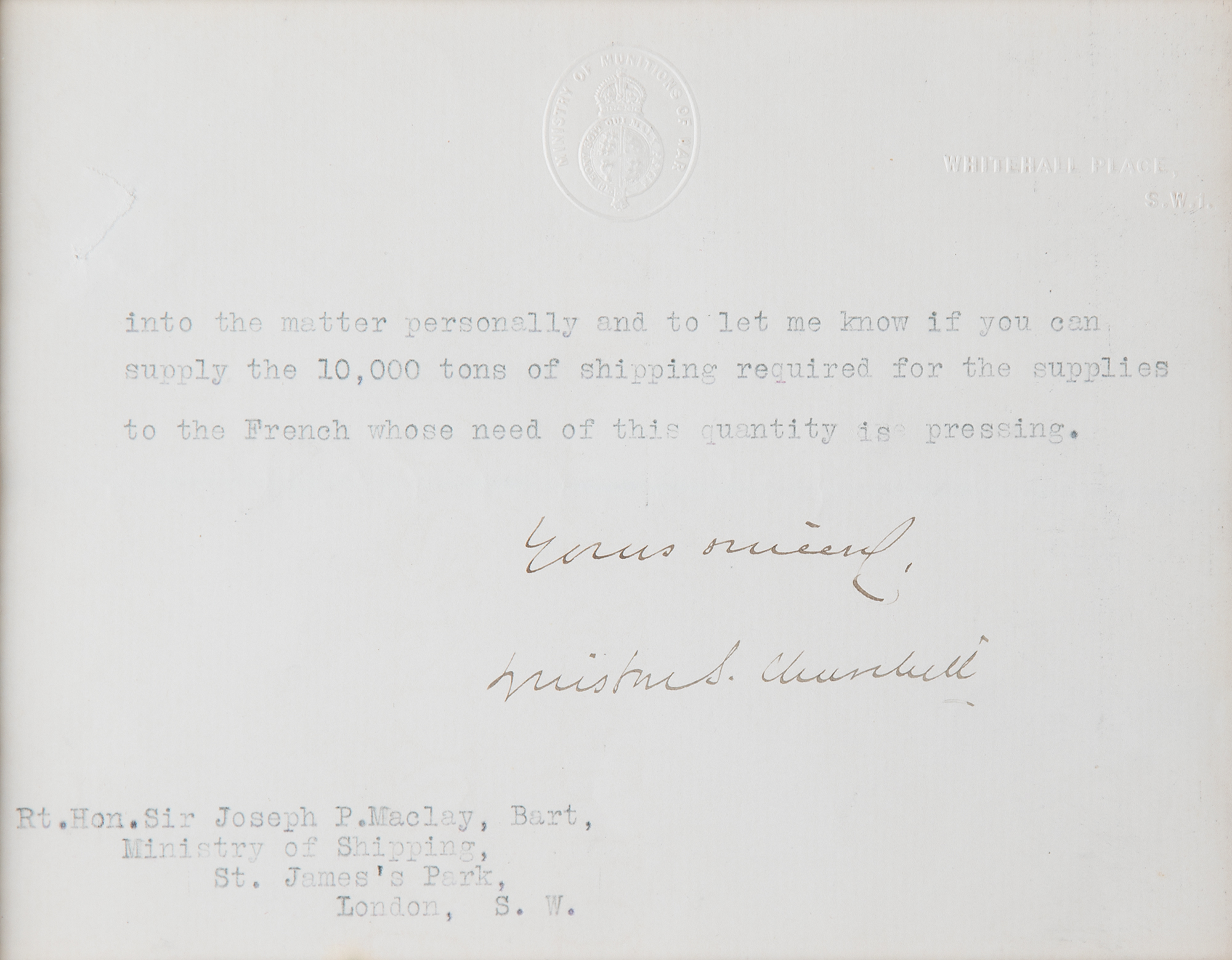 TLS signed “Yours sincerely, Winston S. Churchill,” one page, 7.25 x 5.5, Ministry of Munitions of War letterhead, no date but circa 1917-1919. Conclusion of a letter to Joseph P. Maclay of the Ministry of Shipping, in full: "into the matter personally and to let me know if you can supply the 10,000 tons of shipping required for the supplies to the French whose need of this quantity is pressing." Nicely matted and framed with a portrait and nameplate to an overall size of 23 x 15.5. In fine condition. The British government created the Minister of Munitions position during the First World War to oversee and coordinate the production and distribution of munitions for the war effort; Churchill served in the role from July 17, 1917 to January 10, 1919.