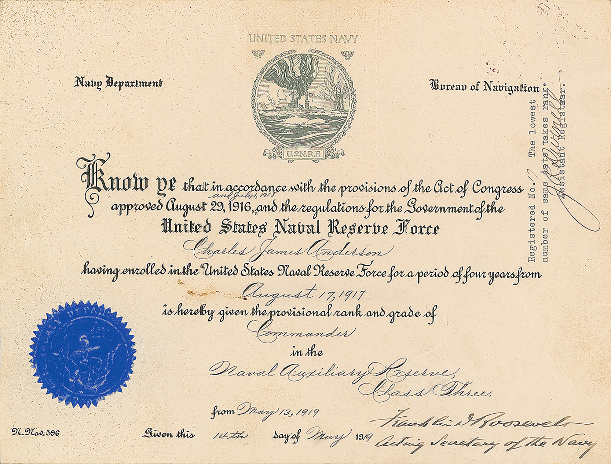 DS signed “Franklin D. Roosevelt, Acting Secretary of the Navy,” one page, 10.5 x 8, May 14, 1919. Official United States Navy commission, in part: “Know ye that in accordance with...the regulations for the Government of the United States Naval Reserve Force, Charles James Anderson...is hereby given the provisional rank and grade of Commander in the Naval Auxiliary Reserve, Class Three.” The blue seal affixed at lower left remains intact. In fine condition, with scattered soiling.