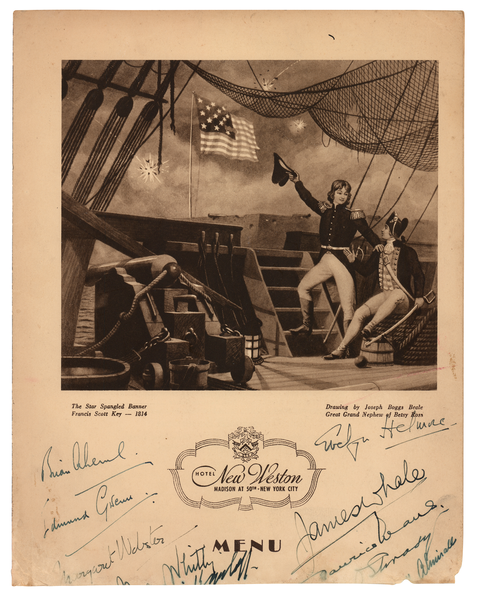 British-born film director (1889-1957) who helmed such horror classics as Frankenstein, The Bride of Frankenstein, and The Invisible Man. Menu from the New Weston Hotel in New York City, 8.5 x 11, signed on the front cover in fountain pen by James Whale and several actors, including: Brian Aherne, Edmund Gwenn, Margaret Webster, Maurice Evans, Evelyn Helmore, and Boris Karloff (whose first name has been trimmed off). In very good to fine condition, with staining and trimming to the bottom edge, affecting several signatures including, unfortunately, Boris Karloff's.