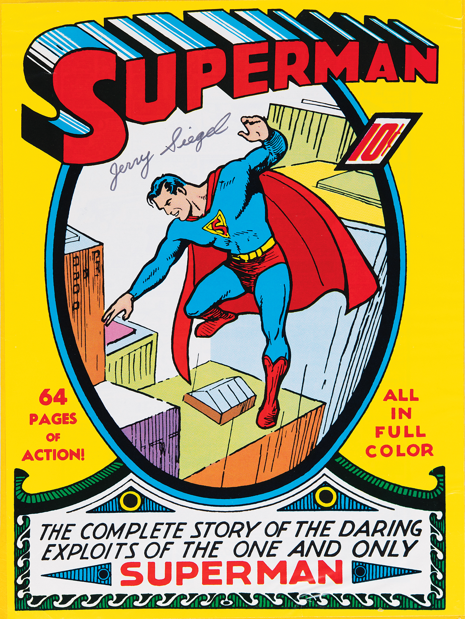 Iconic color 9.75 x 13.25 print on glossy magazine-type stock of the cover design for Superman #1, signed in black felt tip by the iconic comic book character's co-creator, "Jerry Siegel." Affixed to a slightly larger sheet and in very good to fine condition, with wrinkling along the edges from mounting.