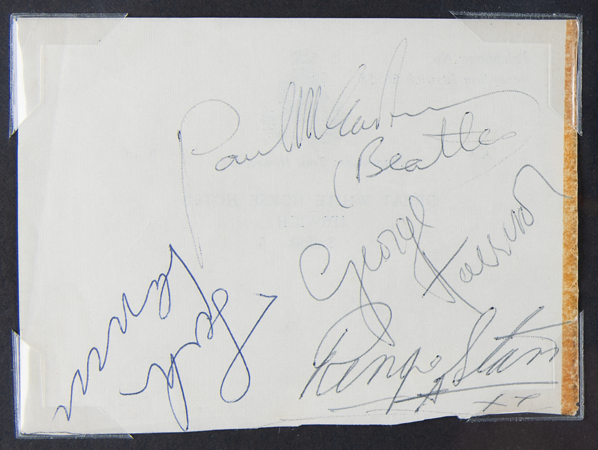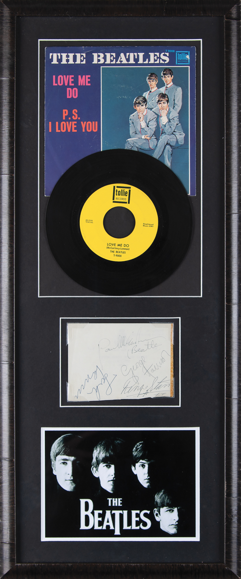 Vintage circa May 1963 ballpoint signatures, "Paul McCartney (Beatles)," "George Harrison," "Ringo Starr," and "John Lennon," on an off-white 4.75 x 3.5 sheet of stationery from the Great White Horse Hotel (as imprinted on the reverse). Nicely corner-mounted, matted, and framed with an original 'Love Me Do / P. S. I Love You' single and picture sleeve to an overall size of 11.5 x 27. In very good to fine condition, with a slightly irregularly trimmed bottom edge, and an old tape along the right edge. Accompanied by a full letter of authenticity from JSA.