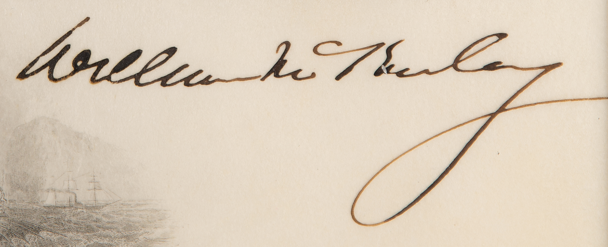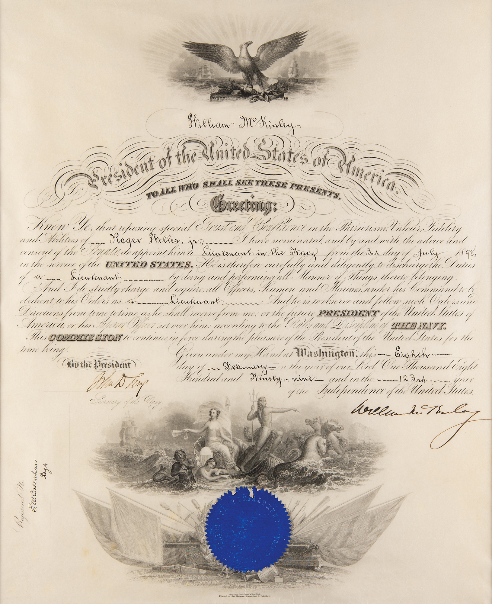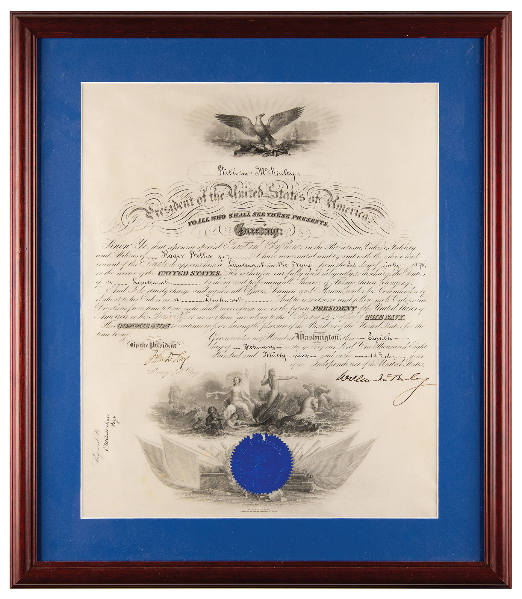 Partly-printed vellum DS as president, one page, 14.25 x 17.5, February 8, 1899. President McKinley appoints Roger Wells, Jr., as "a Lieutenant in the Navy." Boldly signed at the conclusion in ink by President William McKinley, and countersigned by Secretary of the Navy John D. Long. The blue embossed Navy Department seal affixed at the bottom remains intact, with a couple small edge chips. Matted and framed to an overall size of 20 x 23.25. In fine condition. Accompanied by a full letter of authenticity from JSA.
