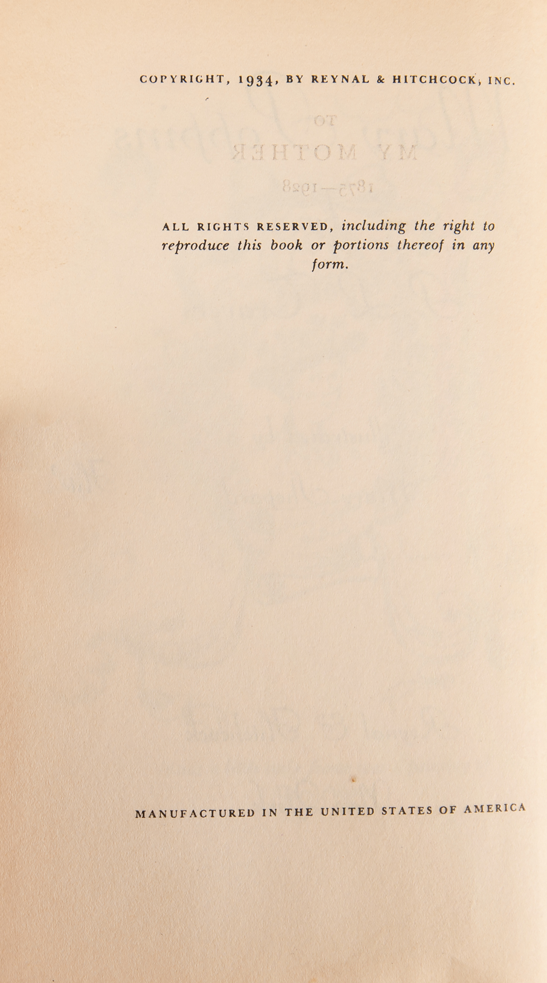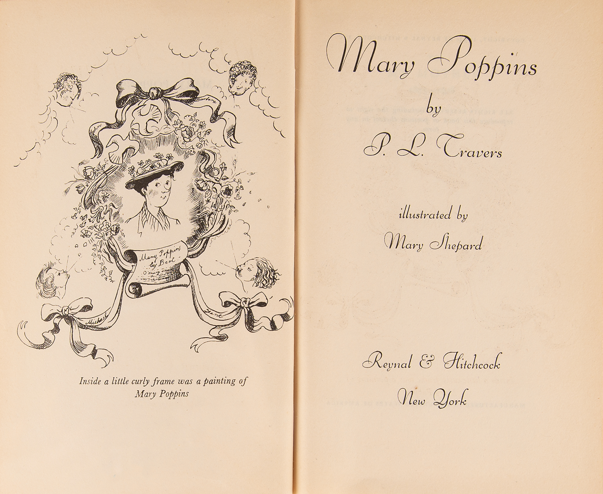 Signed book: Mary Poppins. First edition. NY: Reynal & Hitchcock, 1934. Hardcover with later-issue contemporary dust jacket, 5 x 7.5, 206 pages. Signed on the first free end page in fountain pen, "P. L. Travers." Autographic condition: very good to fine, with light staining touching, but not adversely affecting, the signature. Book condition: VG-/VG-, with minor scattered dampstaining, ownership inscription to first free end page, split paper at front hinge, and nicks, chipping, and some staining to the jacket. A highly desirable signed first edition book as the basis for the classic 1964 film starring Julie Andrews and Dick Van Dyke.