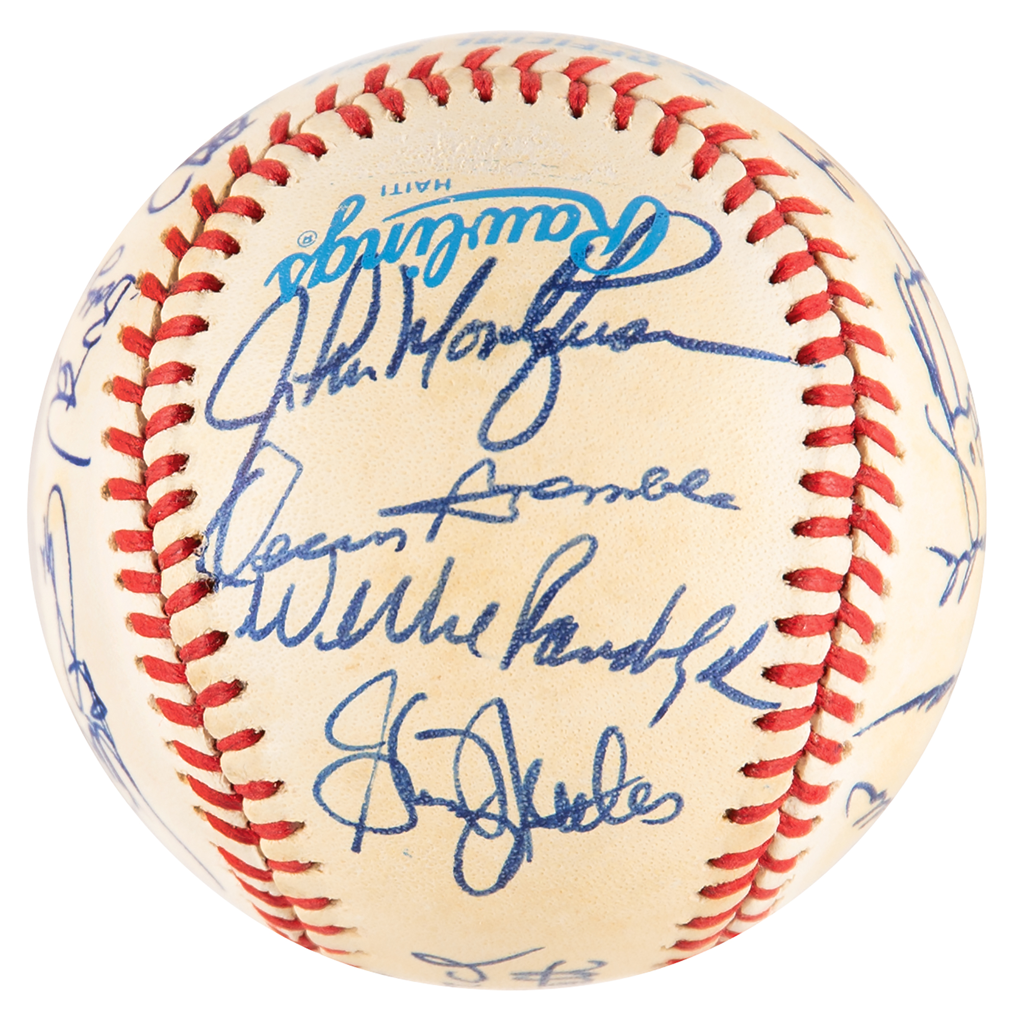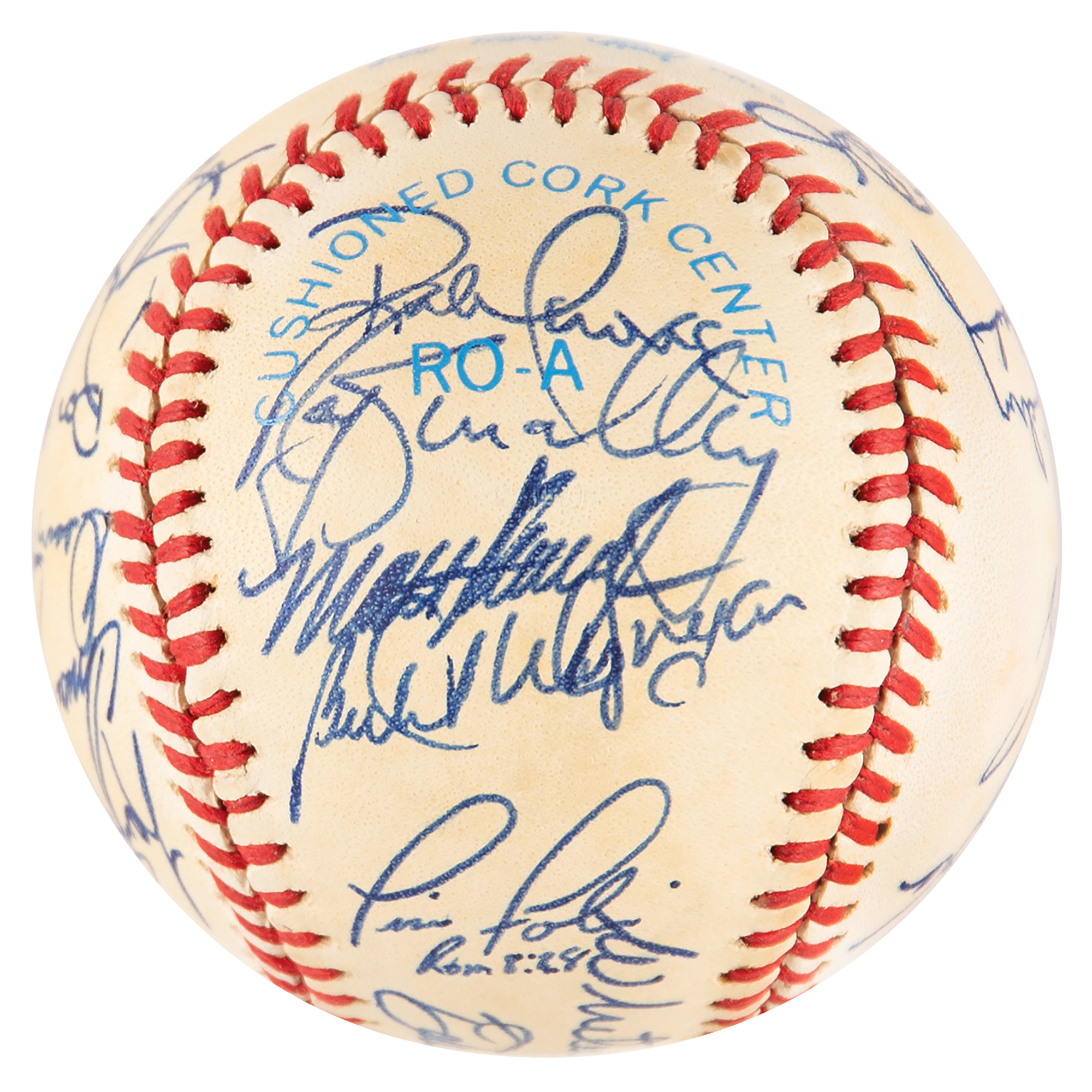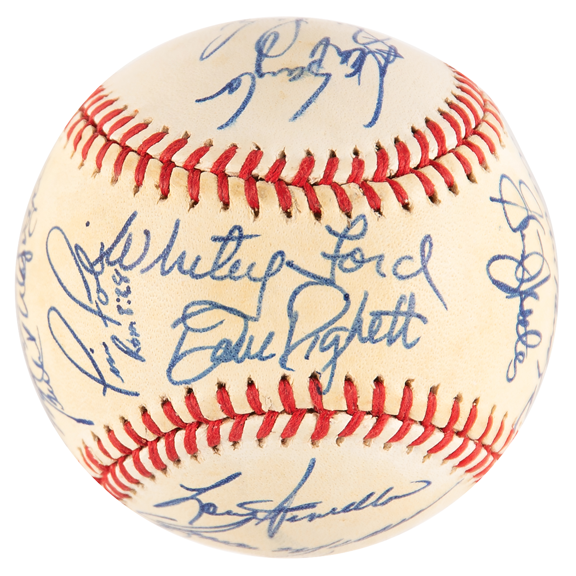 Official Rawlings American League (MacPhail) baseball signed in black felt tip on the sweet spot and side panels by 22 members of the 1984 New York Yankees team, including: Whitey Ford (ss), Dave Righetti (ss), Don Mattingly, Dave Winfield, Ron Guidry, Oscar Gamble, Lou Piniella, Steve Kemp, Bob Shirley, John Montefusco, Willie Randolph, Graig Nettles, Tim Foli, Butch Wynegar, Roy Smalley, Rick Cerone, and others. In fine condition, with light toning over much of the ball. Provenance: the personal collection of Whitey Ford, part of lot 612, Hunt Auctions, July 15, 2008; accompanied by a photocopy of Ford's letter of provenance for the lot.