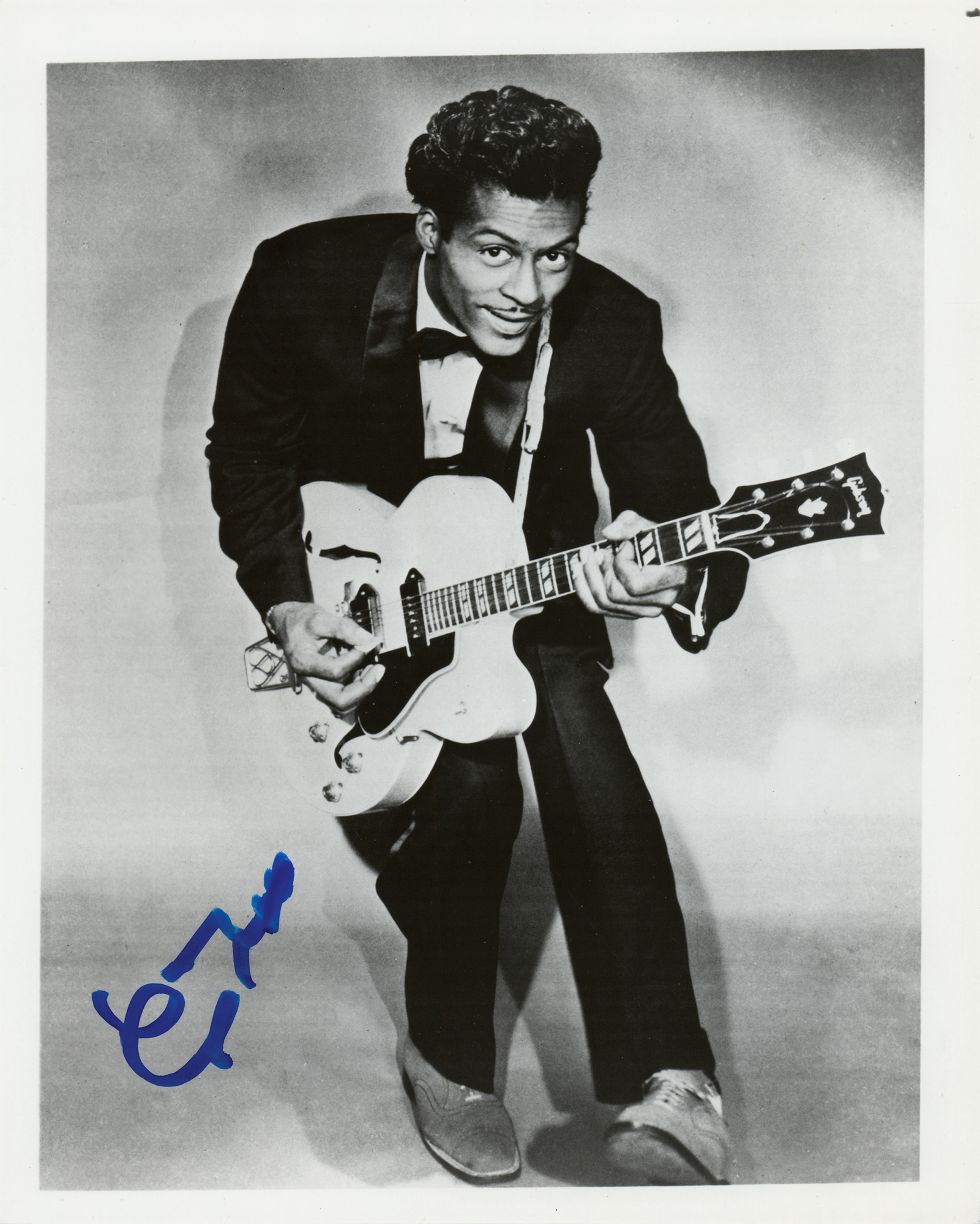 Glossy 8 x 10 photo of Chuck Berry wearing a tux and holding his guitar, signed in blue felt tip. In fine condition. Originally obtained by in-person specialist Mike Wehrmann.
