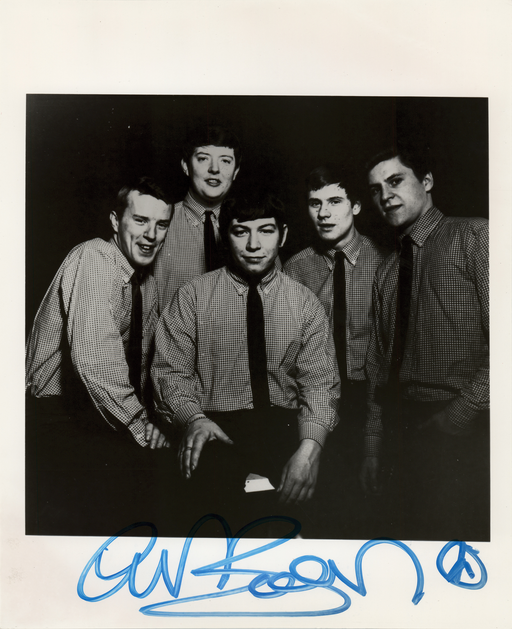 Glossy 8 x 10 photo of The Animals posing in matching outfits, signed in blue felt tip by Eric Burdon. In fine condition. Originally obtained by in-person specialist Mike Wehrmann.