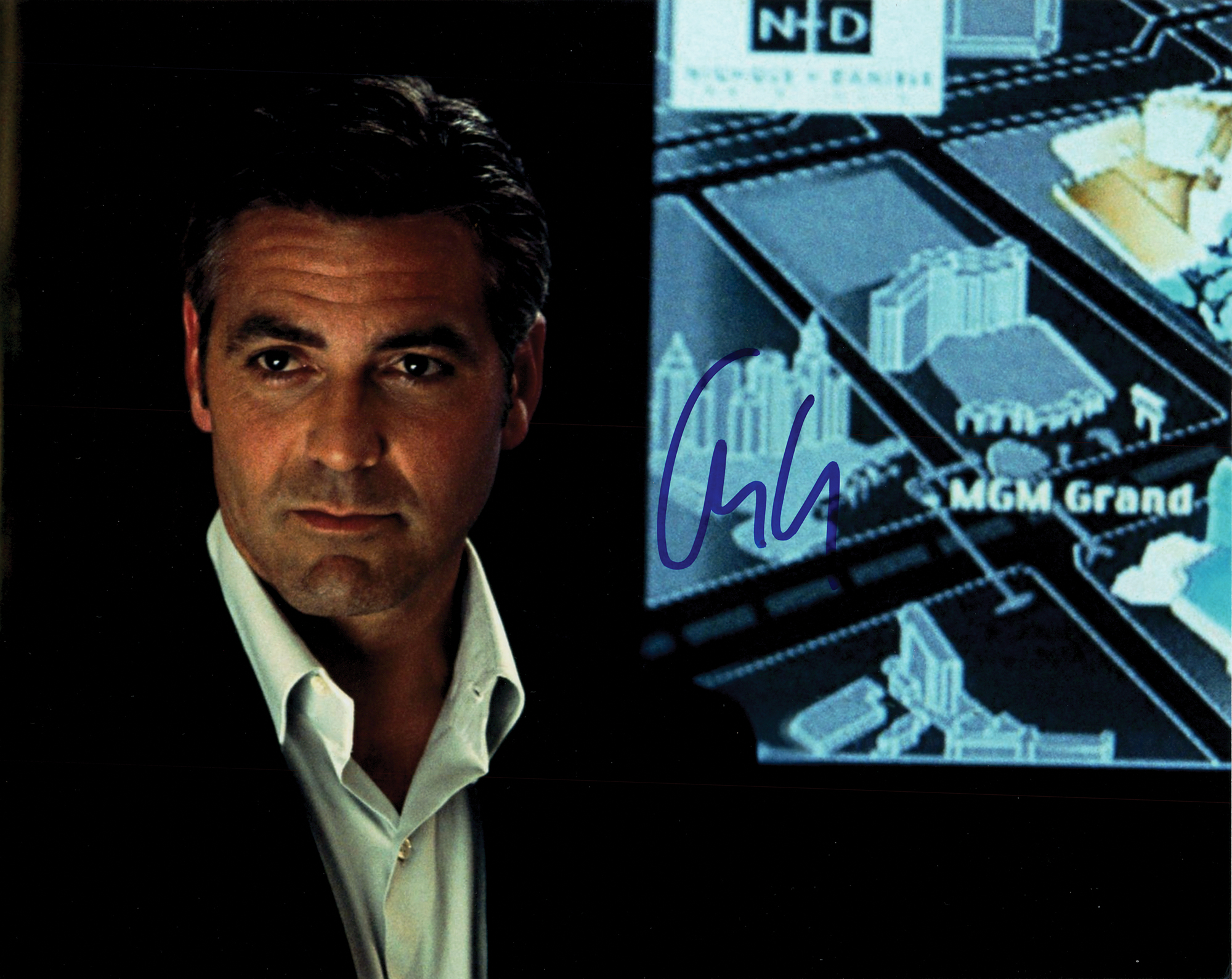 Color glossy 10 x 8 photo of Danny Ocean in Ocean's Eleven, signed in blue felt tip by George Clooney. In fine condition. Originally obtained by in-person specialist Mike Wehrmann.