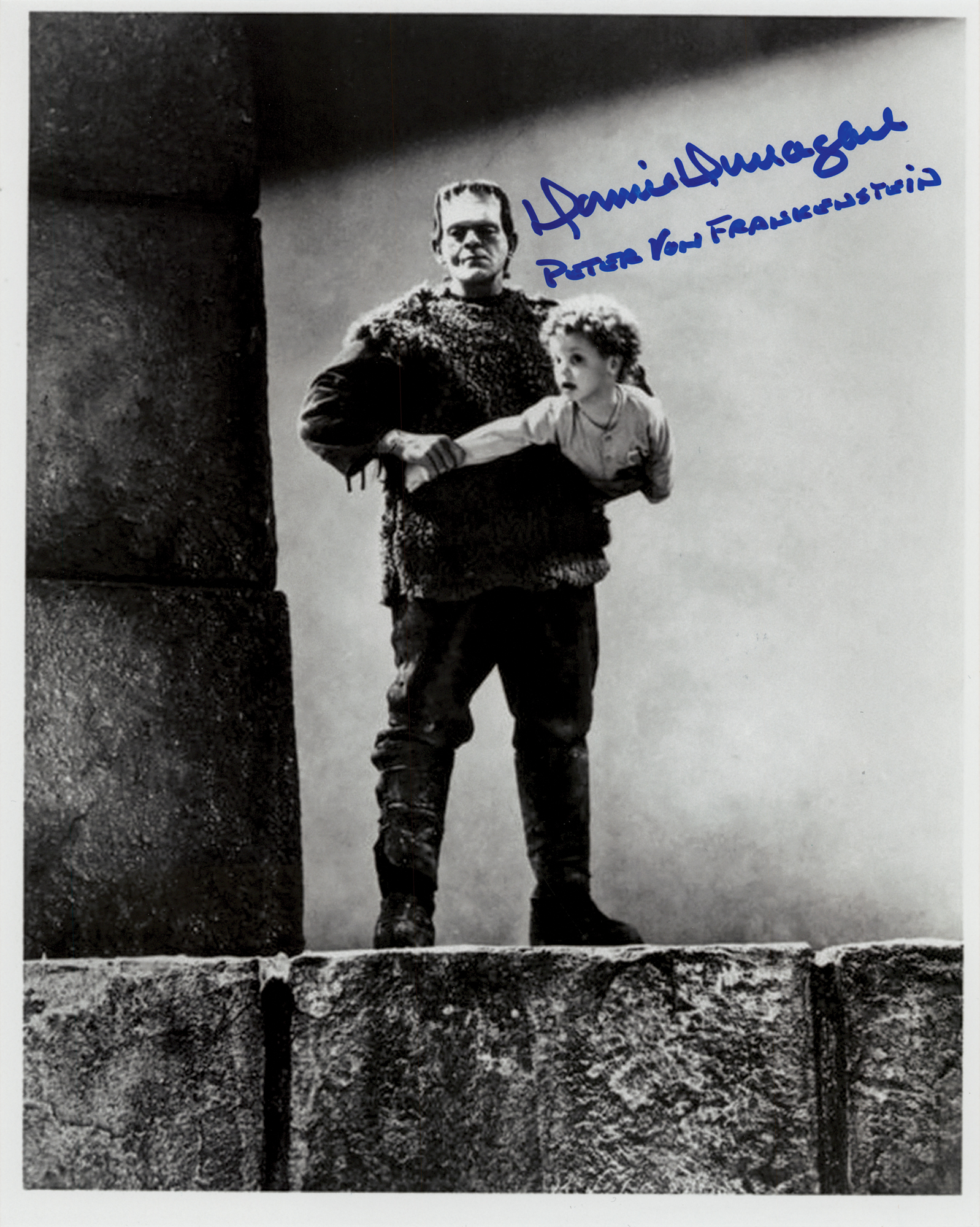 Glossy 8 x 10 photo of the Monster and Peter von Frankenstein in Son of Frankenstein, signed in blue felt tip by Donnie Dunagan. In very fine condition. Originally obtained by in-person specialist Mike Wehrmann.