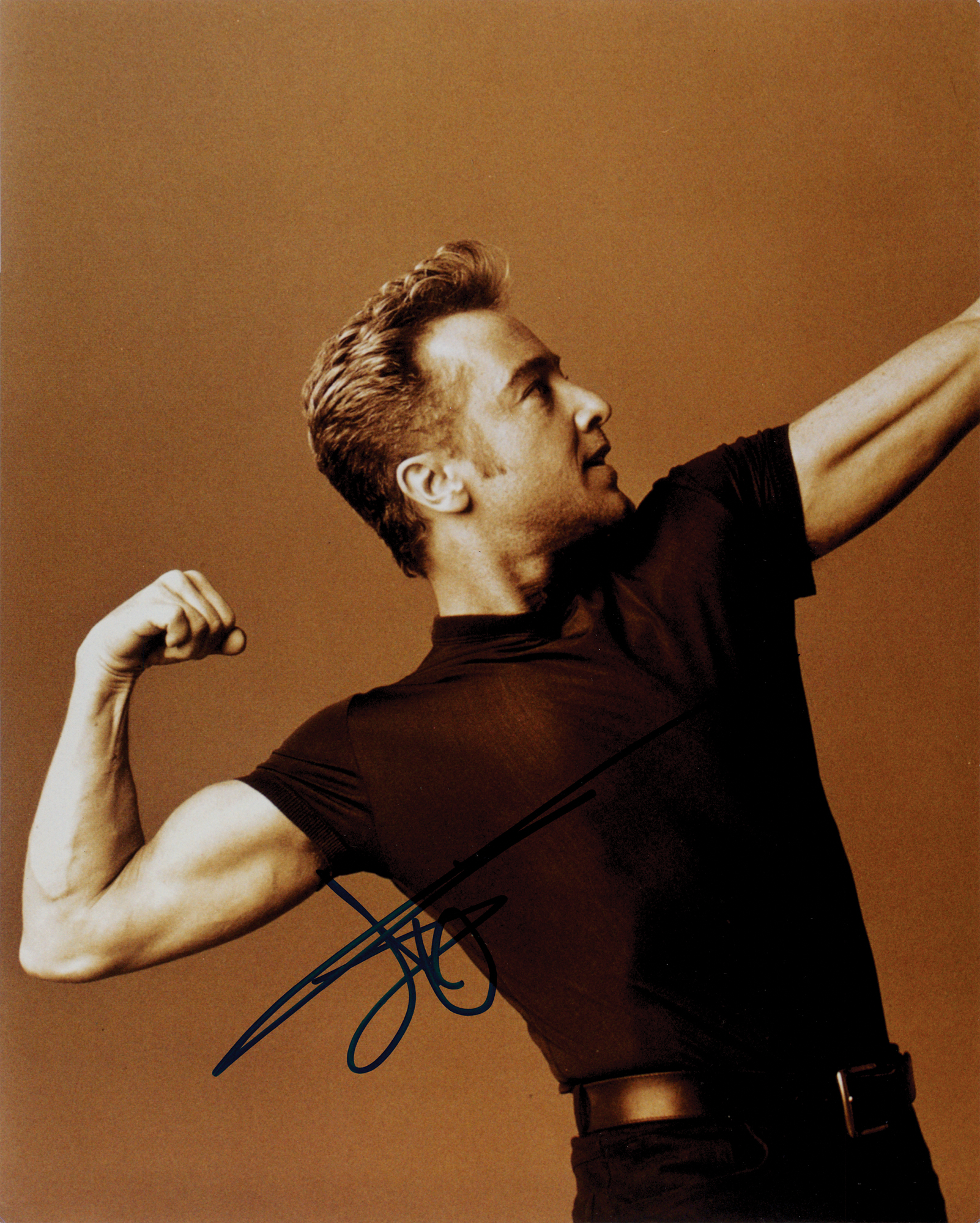 Color glossy 8 x 10 photo of Michael Flatley striking a powerful pose, signed in blue felt tip. In fine condition. Originally obtained by in-person specialist Mike Wehrmann.