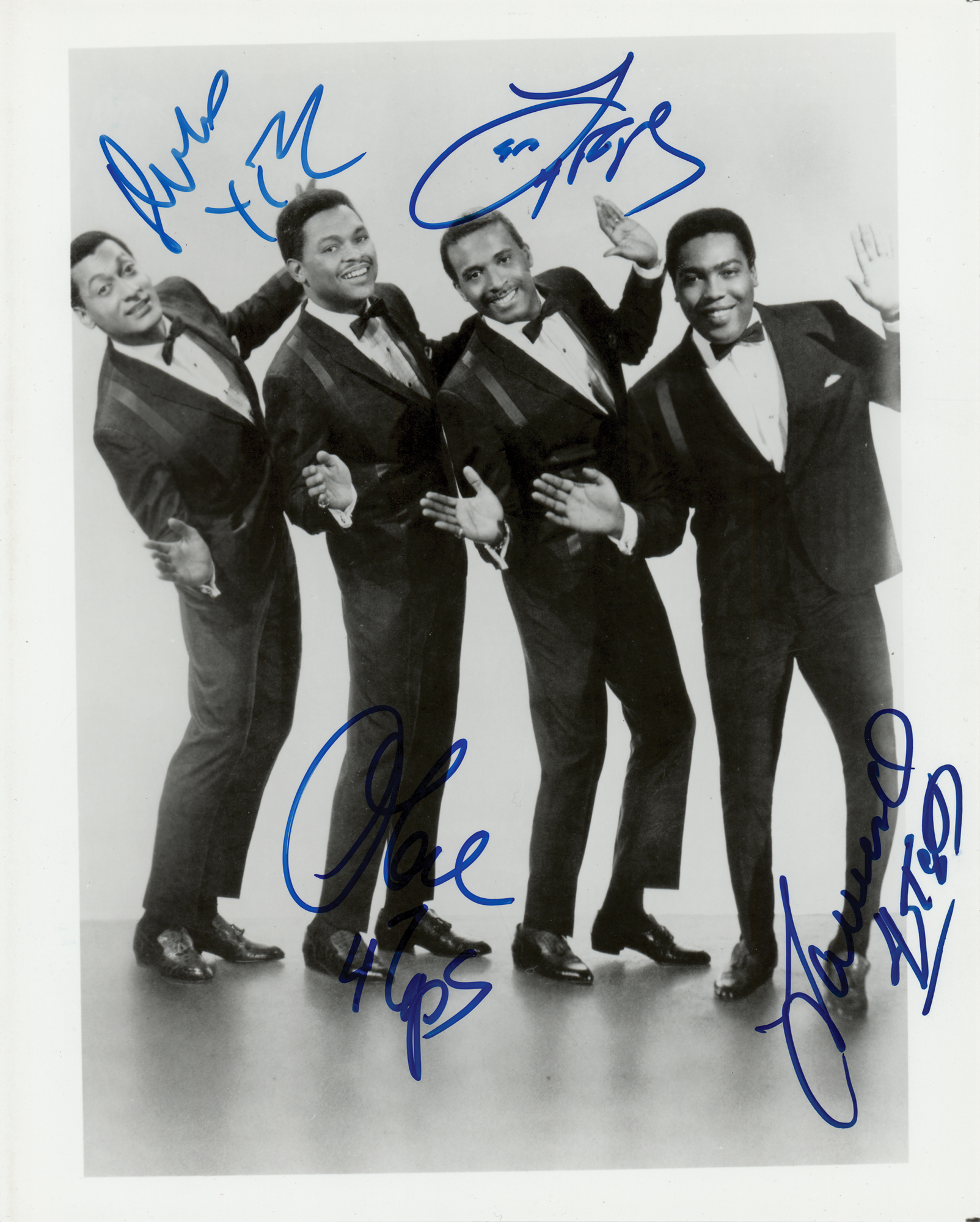 Glossy 8 x 10 photo of The Four Tops in matching suits, signed in blue felt tip by Obie Benson, Levi Stubbs, Lawrence Payton, and Duke Fakir. In very fine condition. Originally obtained by in-person specialist Mike Wehrmann.