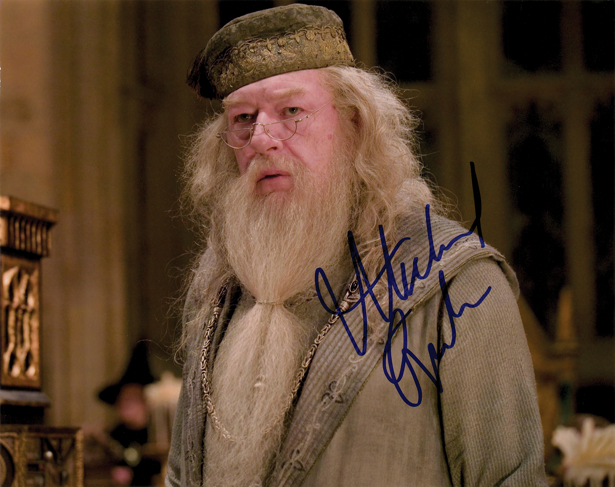 Color satin-finish 10 x 8 photo of Michael Gambon as Albus Dumbledore from the Harry Potter film franchise, signed in blue felt tip. In fine condition. Originally obtained by in-person specialist Mike Wehrmann.