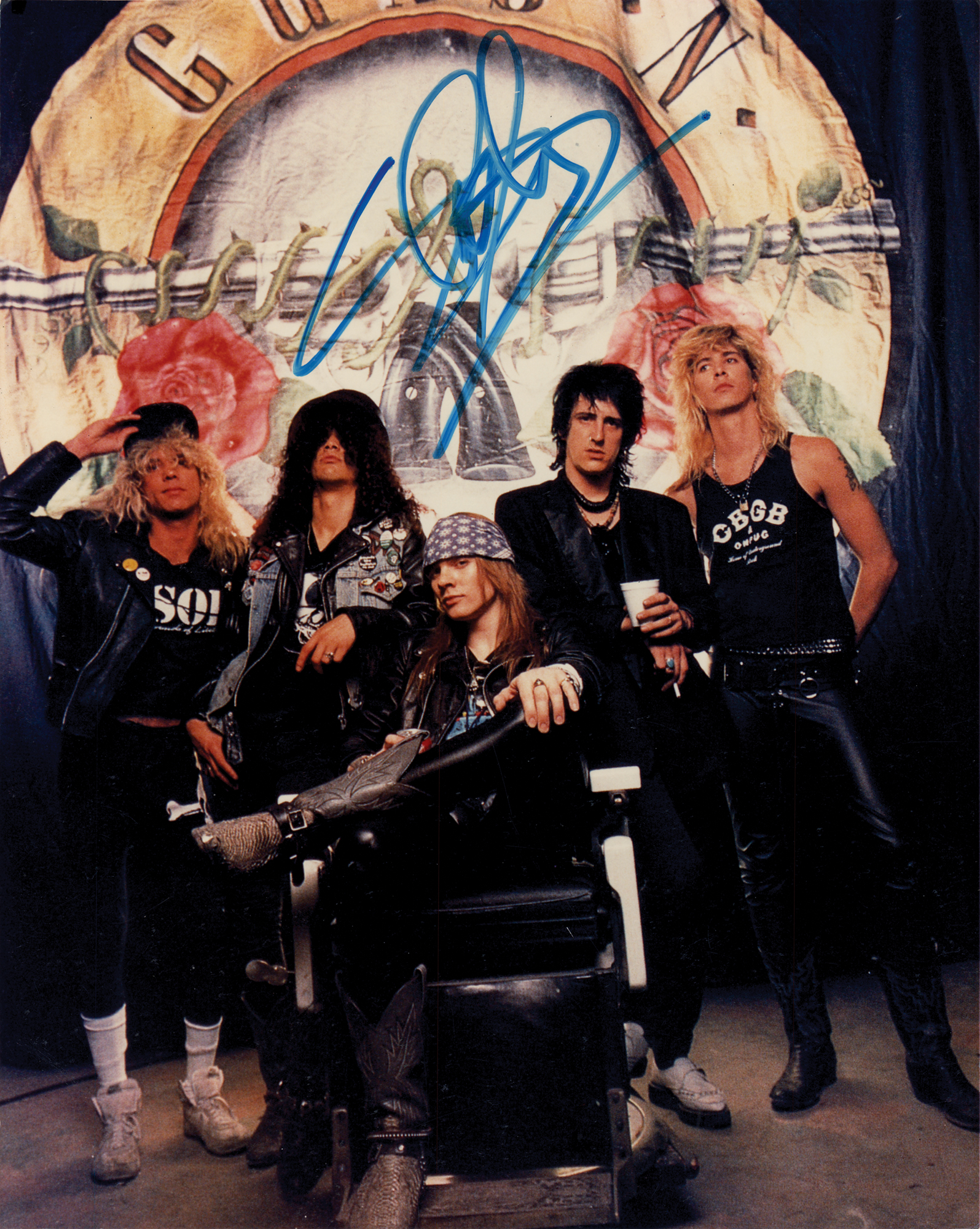 Color glossy 8 x 10 photo of Guns N' Roses posing in front of their logo, signed in blue felt tip by lead guitarist Slash. In fine condition. Originally obtained by in-person specialist Mike Wehrmann.