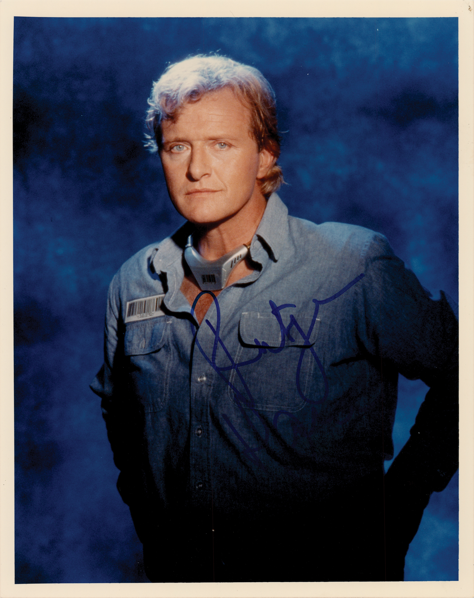 Color glossy 8 x 10 photo of Rutger Hauer as Frank Warren in the 1991 film Wedlock, signed in blue felt tip. In very fine condition. Originally obtained by in-person specialist Mike Wehrmann.