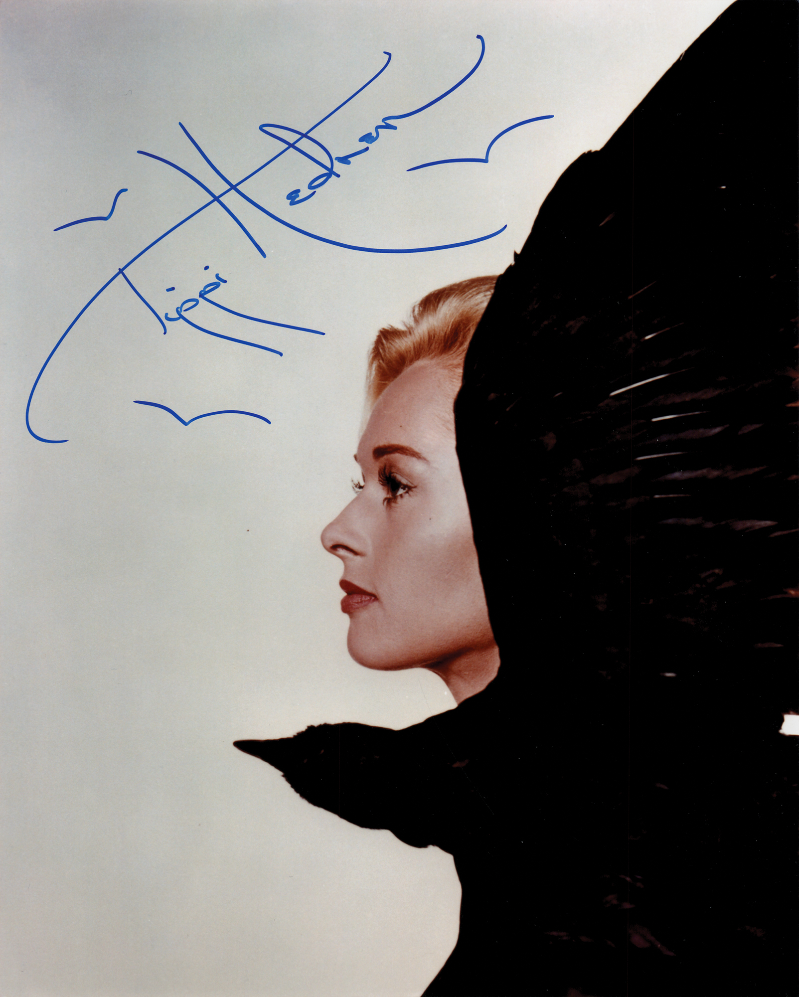 Color satin-finish 8 x 10 photo of Melanie Daniels from Alfred Hitchcock's 1963 film The Birds, signed in blue felt tip by Tippi Hedren who adds several birds around her signature. In fine condition. Originally obtained by in-person specialist Mike Wehrmann.