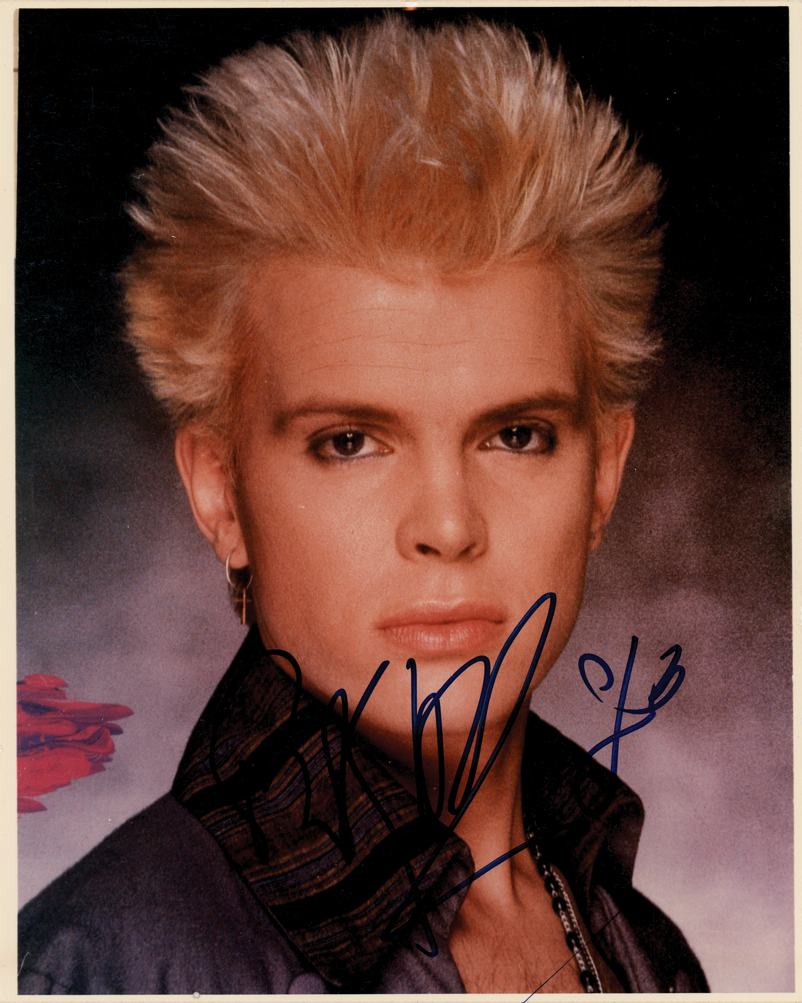 Color glossy 8 x 10 photo of Billy Idol in a head-and-shoulders pose, signed in blue felt tip. In fine condition, with a tiny pin hole in the bottom border. Originally obtained by in-person specialist Mike Wehrmann.