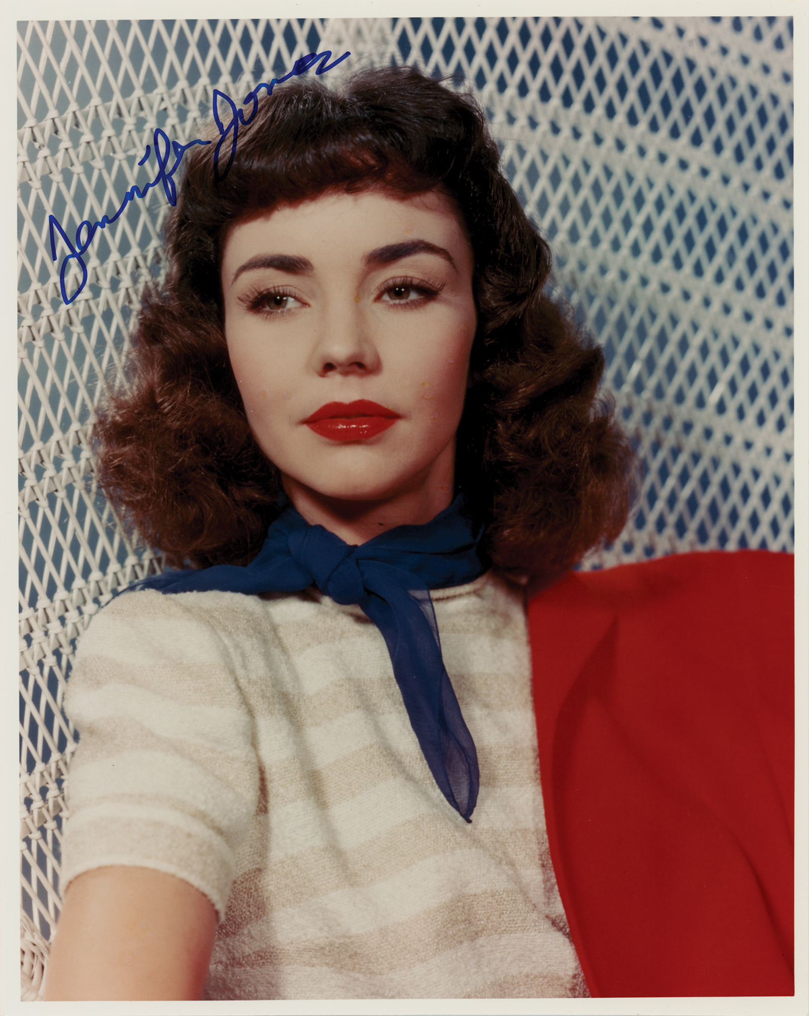 Color glossy 8 x 10 photo of Jennifer Jones in a creme shirt and blue scarf, signed in blue felt tip. In very fine condition. Originally obtained by in-person specialist Mike Wehrmann.