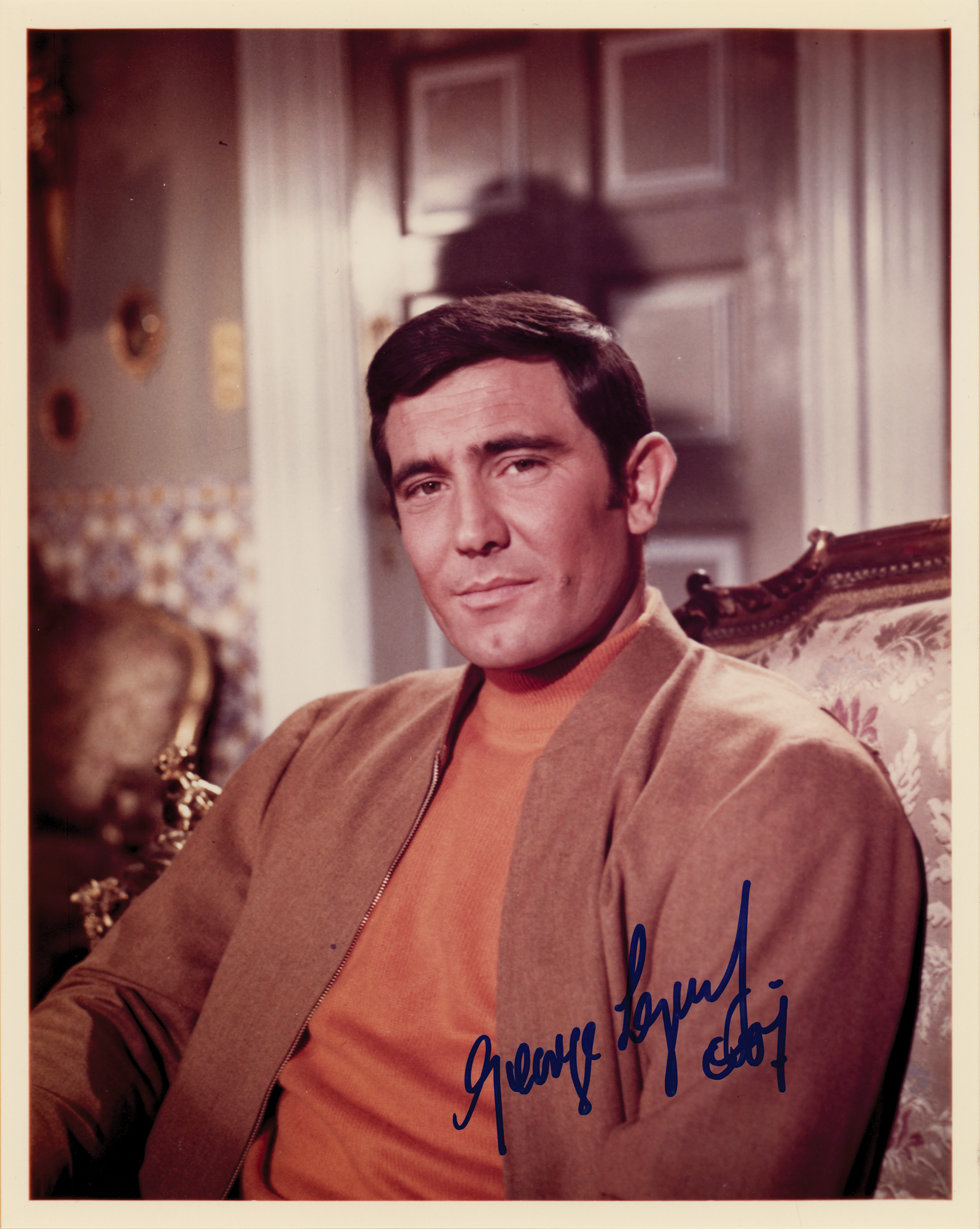 Color glossy 8 x 10 photo of George Lazenby as James Bond, signed in blue felt tip, "George Lazenby, 007." In very fine condition. Originally obtained by in-person specialist Mike Wehrmann.