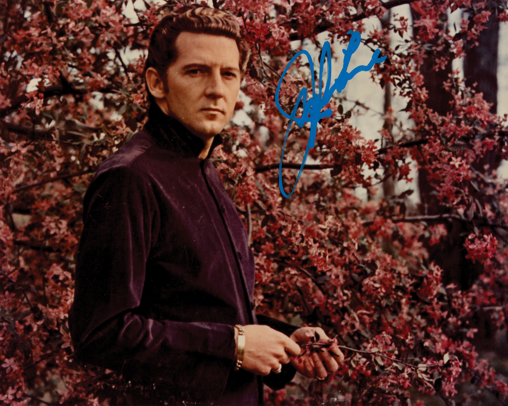 Color glossy 10 x 8 photo of Jerry Lee Lewis in a waist-up pose, signed in blue paint pen. In fine condition. Originally obtained by in-person specialist Mike Wehrmann.