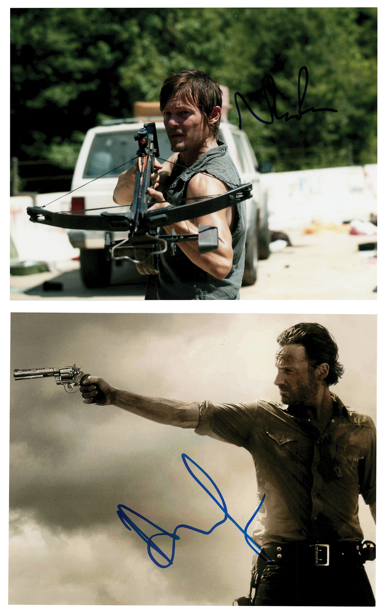 Two color satin-finish 10 x 8 photos of Andrew Lincoln and Norman Reedus in The Walking Dead, individually signed in blue felt tip. In fine condition. Originally obtained by in-person specialist Mike Wehrmann.