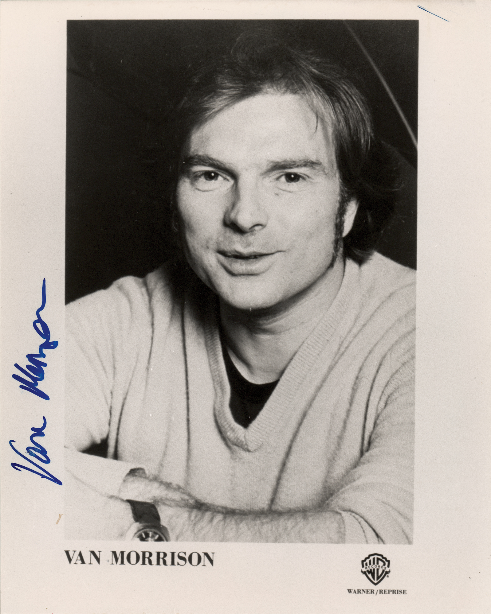 Glossy 8 x 10 Warner Bros. Records publicity photo of Van Morrison in a head-and-shoulders pose, signed in blue felt tip. In fine condition, with a stray ink mark to the upper right corner. Originally obtained by in-person specialist Mike Wehrmann.