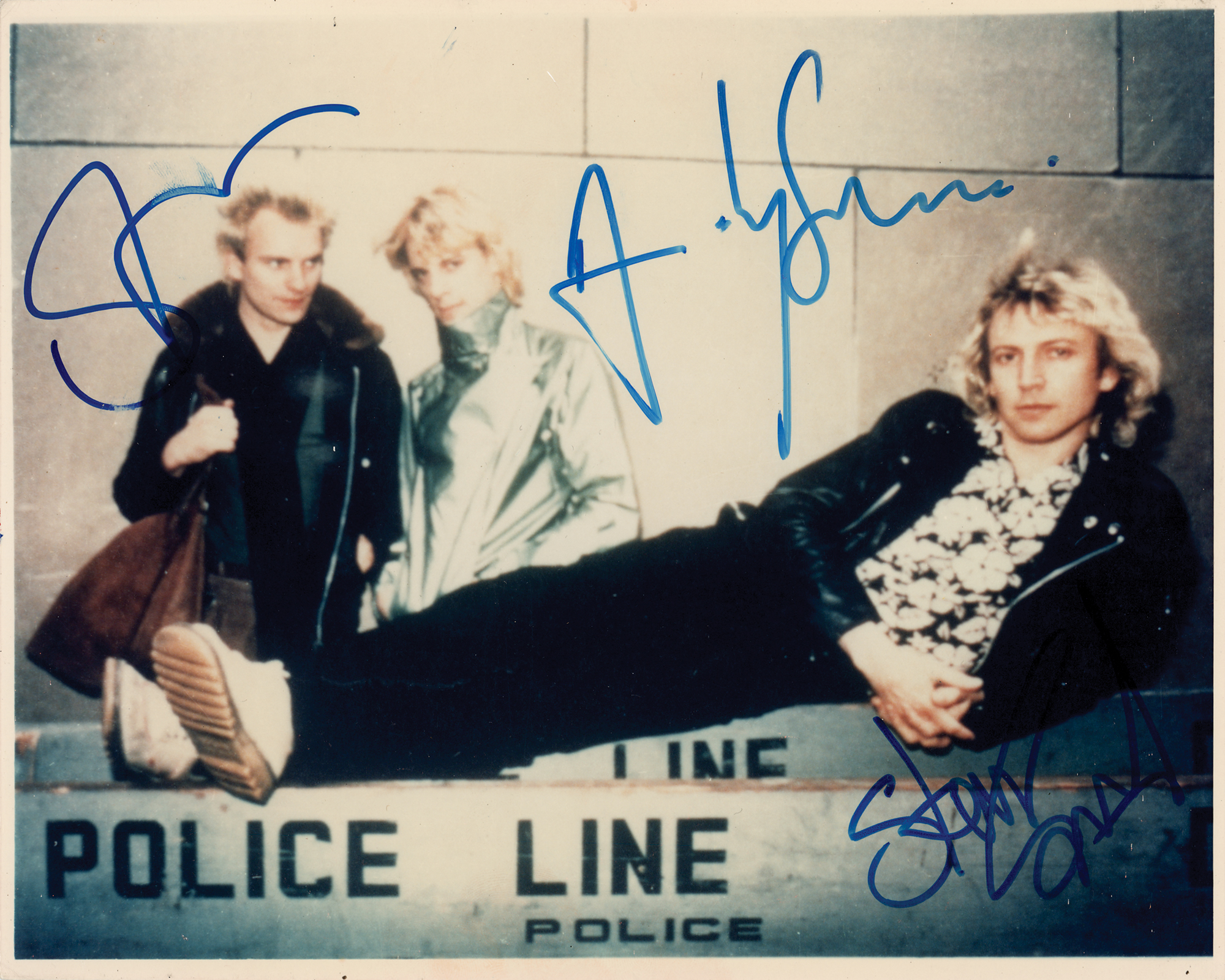Color glossy 10 x 8 photo of The Police, signed in blue felt tip by Sting, Andy Summers, and Stewart Copeland. In very good to fine condition, with light surface scuffing, and a slight brush to Sting's signature. Originally obtained by in-person specialist Mike Wehrmann.