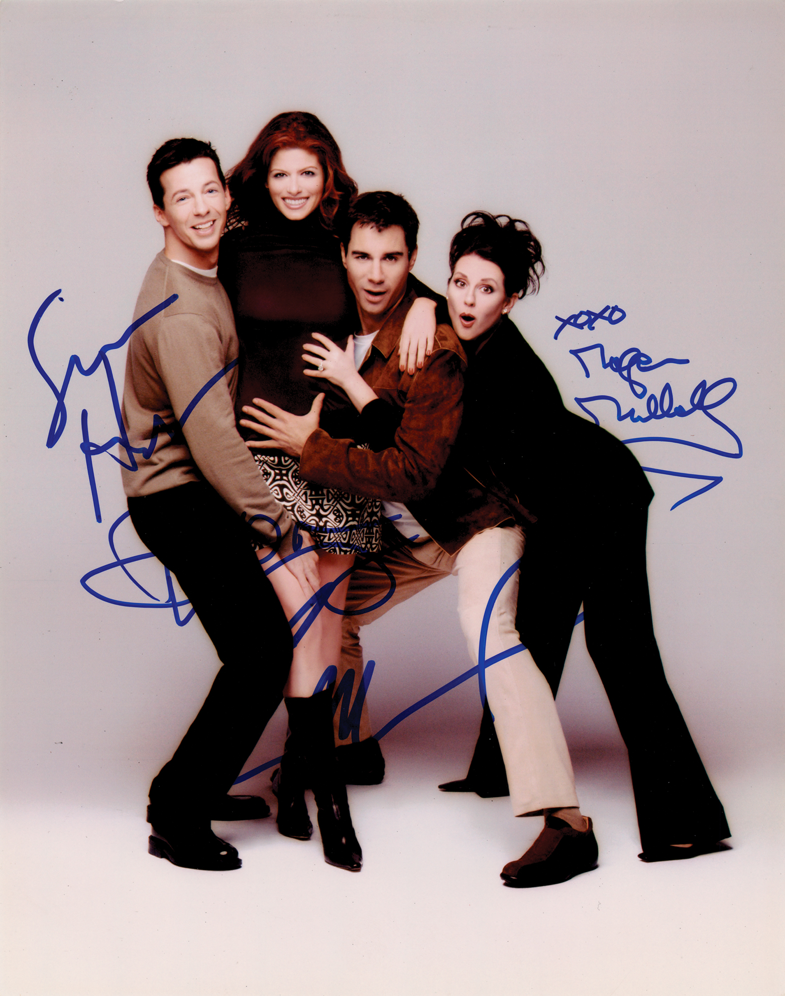 Color glossy 8 x 10 photo of the cast of Will and Grace, signed in blue felt tip by Debra Messing, Eric McCormack, Megan Mullally, and Sean Hayes. In fine condition, with a couple of small creases to the top edge. Originally obtained by in-person specialist Mike Wehrmann.
