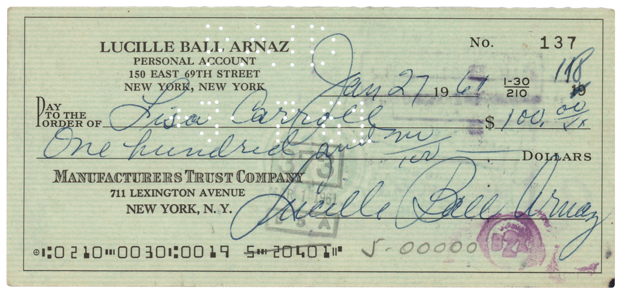 Personal check, 6 x 2.5, filled out and signed by Ball, "Lucille Ball Arnaz," payable to Lisa Carroll for $100, January 27, 1967. In fine condition.