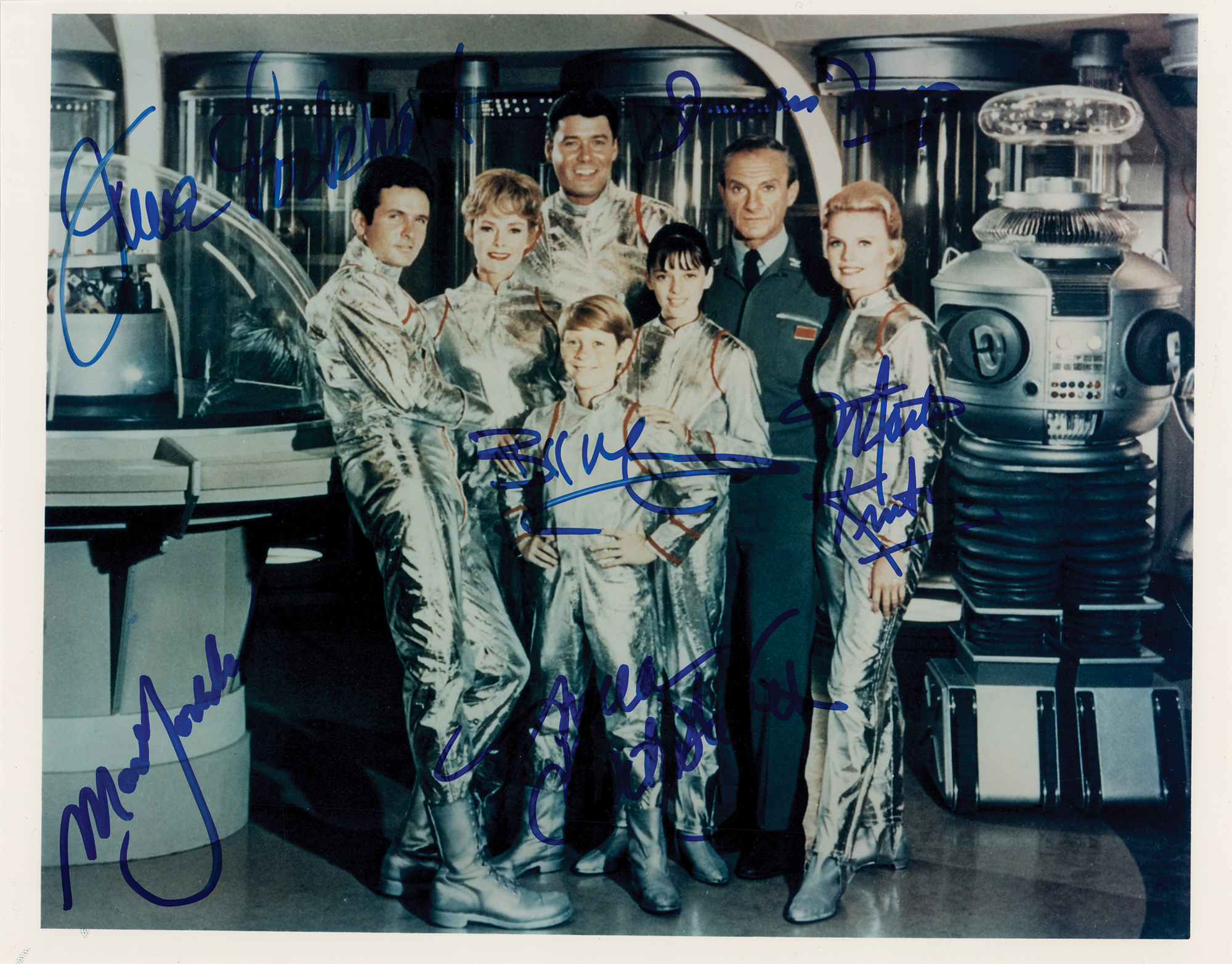 Color glossy 10 x 8 photo of the cast of Lost in Space, signed in blue felt tip by June Lockhart, Mark Goddard, Marta Kristen, Bill Mumy, Angela Cartwright, and Jonathan Harris. In very fine condition. Originally obtained by in-person specialist Mike Wehrmann.