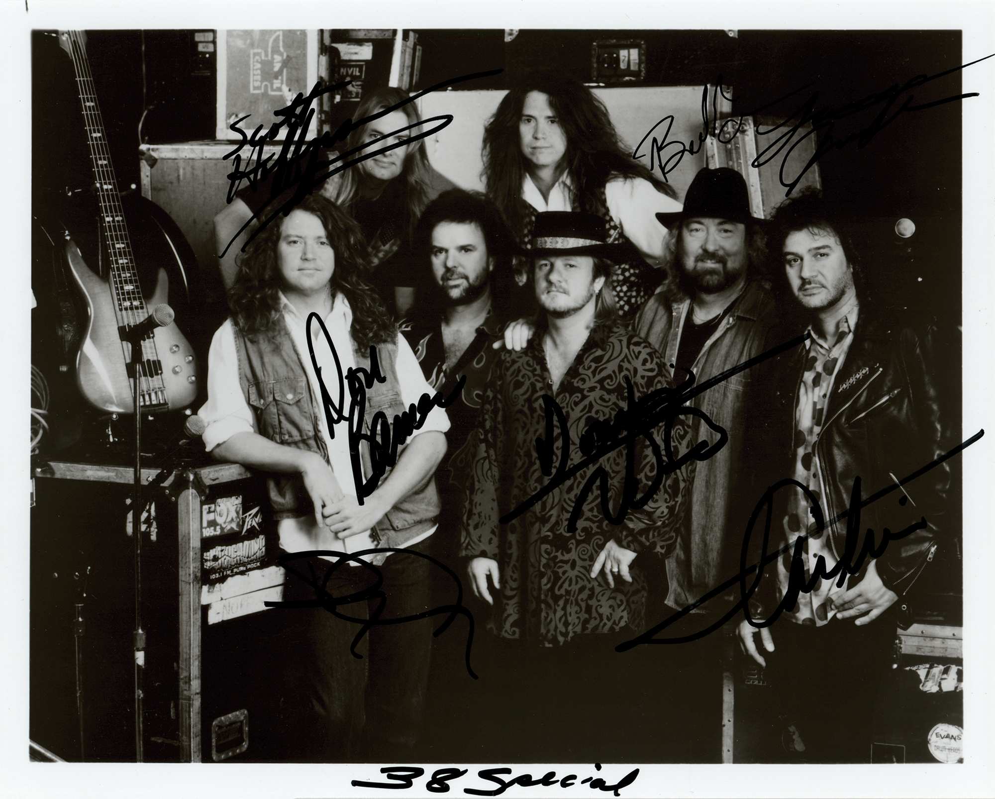 Glossy 10 x 8 photo of 38 Special, signed in black felt tip by Donnie Van Zant, Don Barnes, Scott Hoffman, Jeff Carlisi, Larry Junstrom, and Bobby Capps. In fine condition.
