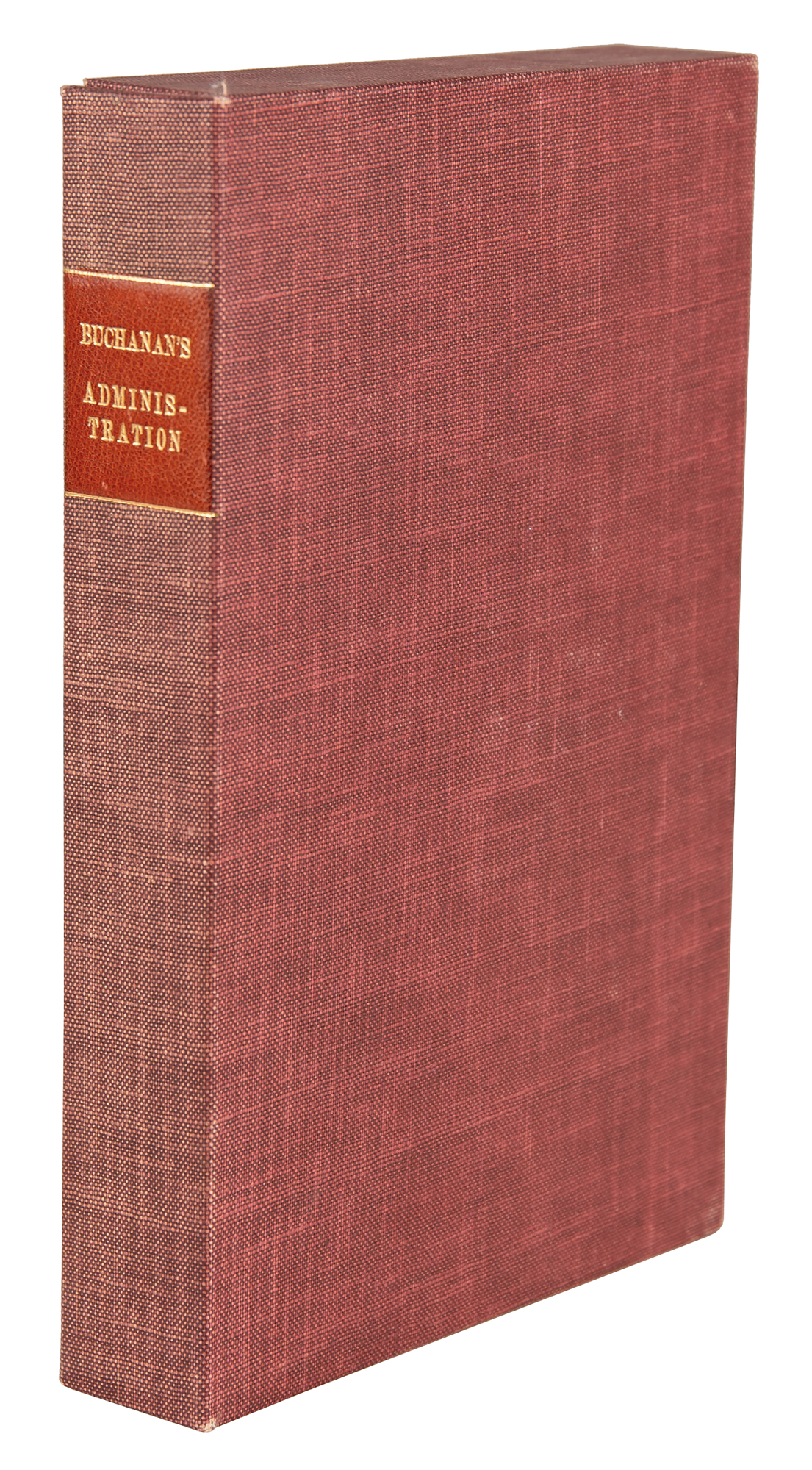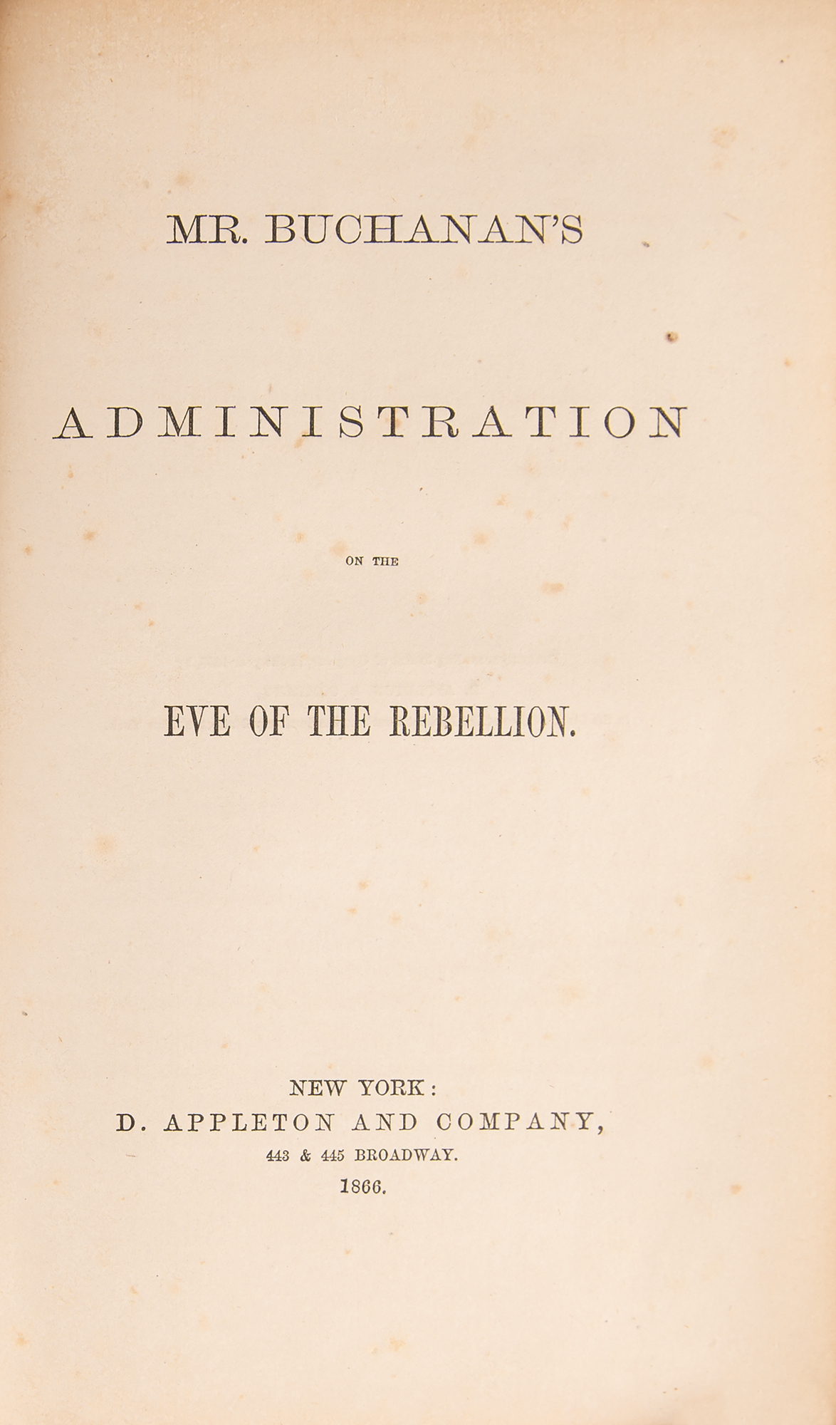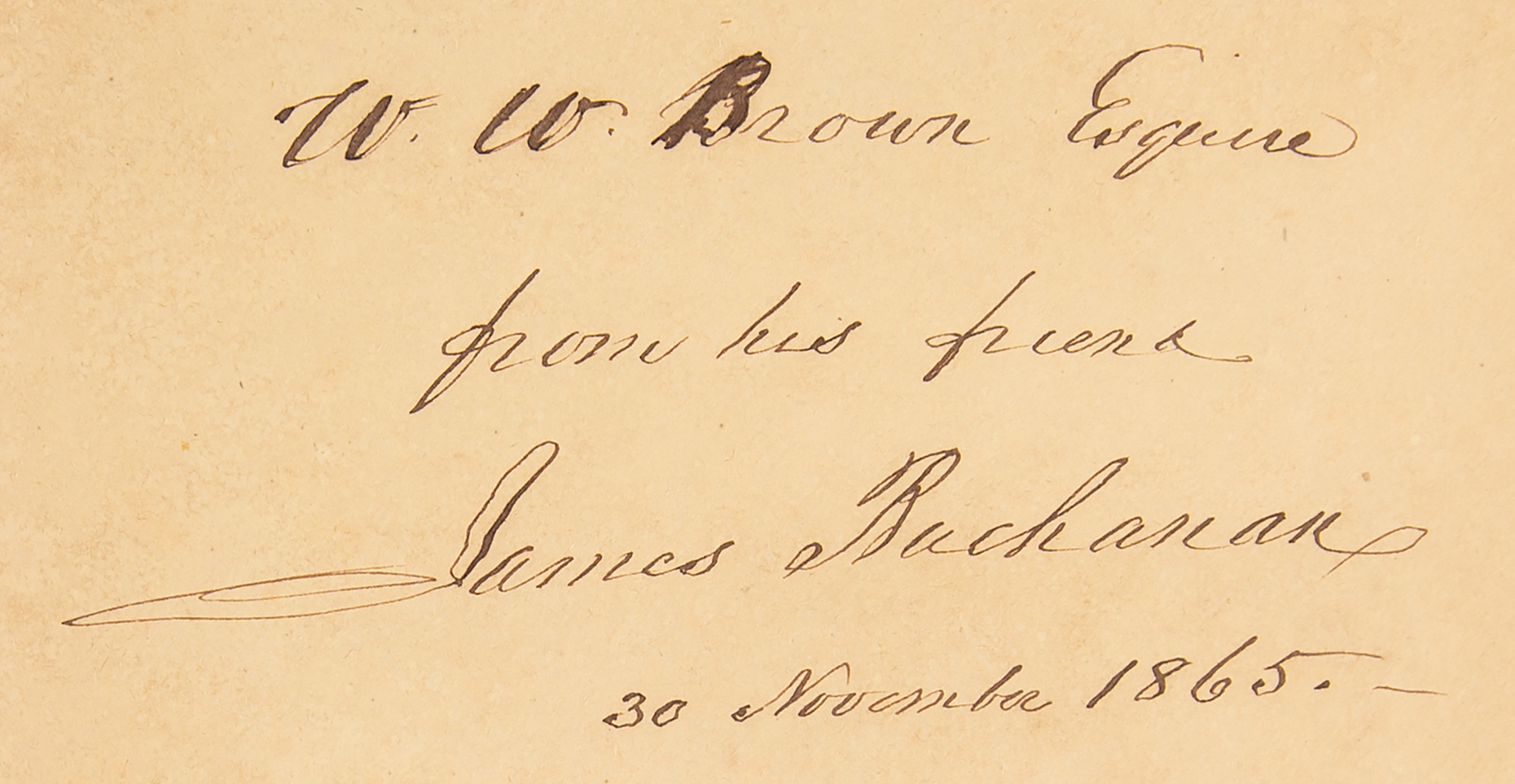 Signed book: Mr. Buchanan's Administration on the Eve of the Rebellion. First edition. NY: D. Appleton and Company, 1866. Hardcover, 6 x 9.5, 296 pages. Signed and inscribed on the first free end page in ink, "W. W. Brown Esquire, from his friend James Buchanan, 30 November 1865." Autographic condition: fine. Book condition: VG-/None, with cracked hinges, wear and some splitting to spine cloth at joints, bumped corners, and rubbing to boards. Accompanied by a custom-made clamshell case.