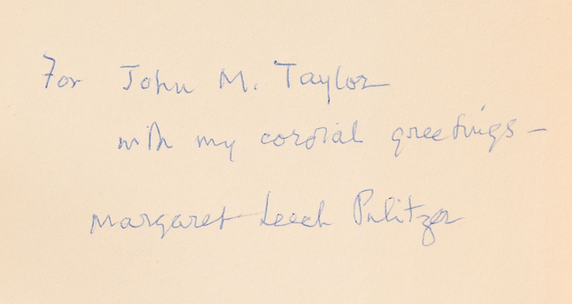 American historian (1893-1974) who won the Pulitzer Prize for History in 1942 for Reveille in Washington, and in 1960 for In the Days of McKinley. Signed book: Reveille in Washington: 1860-1865. Later printing. NY: Harper & Brothers, 1941. Hardcover, 6.5 x 9.5, 483 pages. Signed and inscribed on the half-title page in blue ballpoint to historian and biographer John Maxwell Taylor, "For John M. Taylor—with my cordial greetings—Margaret Leech Pulitzer." Autographic condition: fine. Book condition: VG-/None, with a cracked front hinge, edgewear, and rubbing to boards; Taylor's personal bookplate is affixed to the front pastedown.