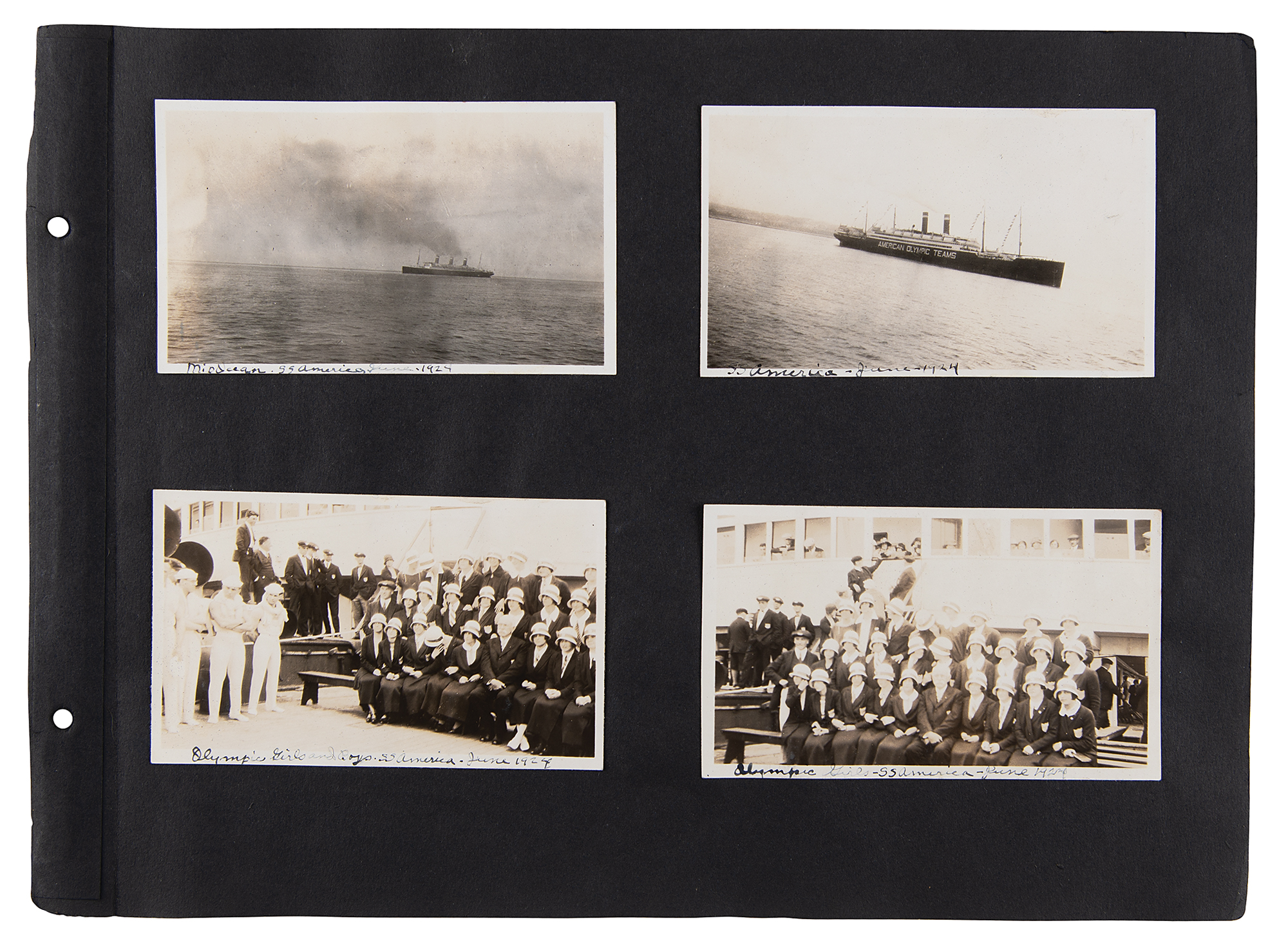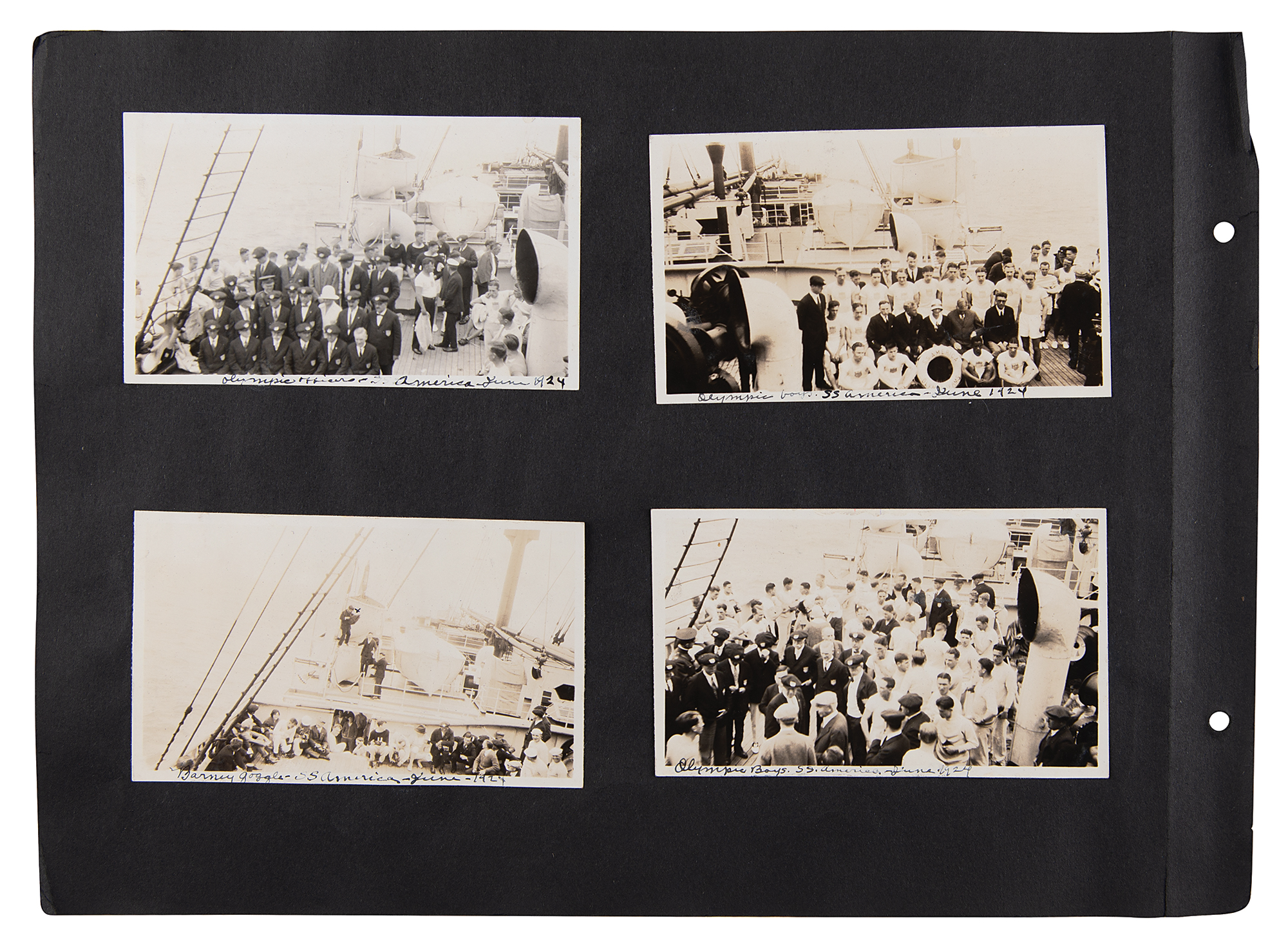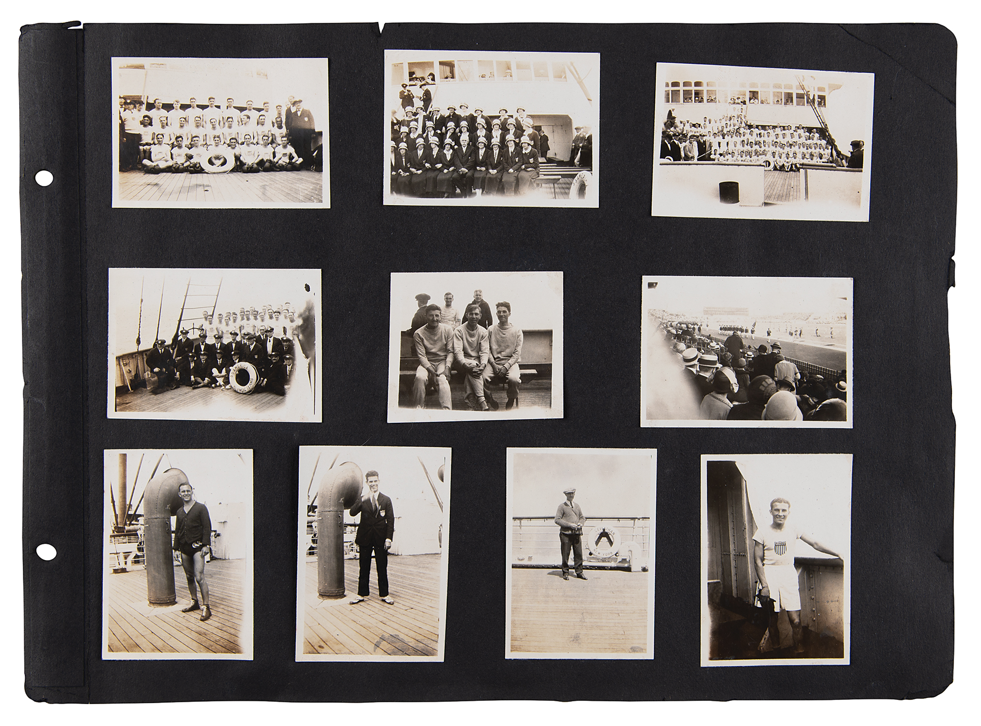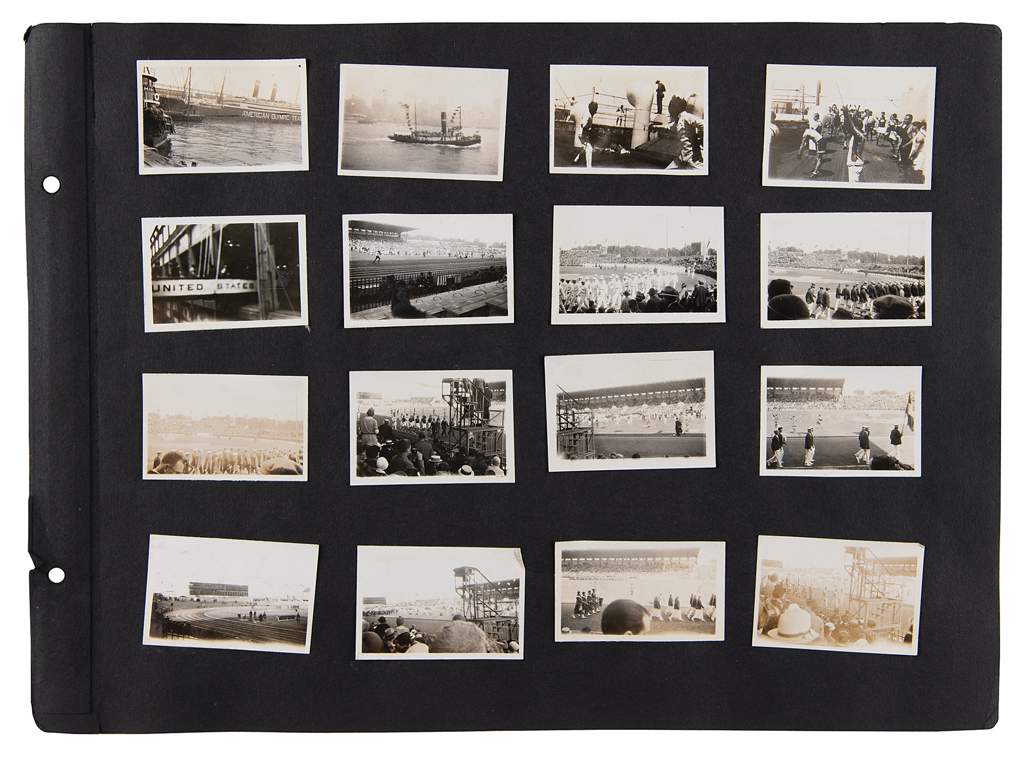 One-of-a-kind collection of 99 original photographs from the Paris 1924 Summer Olympics, chronicling the United States team's voyage over on the SS America and the athletes training and competing in Paris, plus some standard Parisian sight-seeing snapshots. The photos range in size from 2.5 x 1.5 to 5.5 x 3.5, and are affixed to both sides of eight black 15 x 11 photo album pages. Shots taken on the SS America include several group photos of the athletes and officials in the traveling party, as well as single portraits and smaller groups. Photos taken at the Olympic events include swimming and athletics, and a few subjects of the 'sight-seeing' photos are the Statue of Liberty, the Louvre, and the Arc de Triomphe, and various Paris street scenes. In overall fine condition. A unique, behind-the-scenes look at the 1924 American Olympic team. In fine condition.