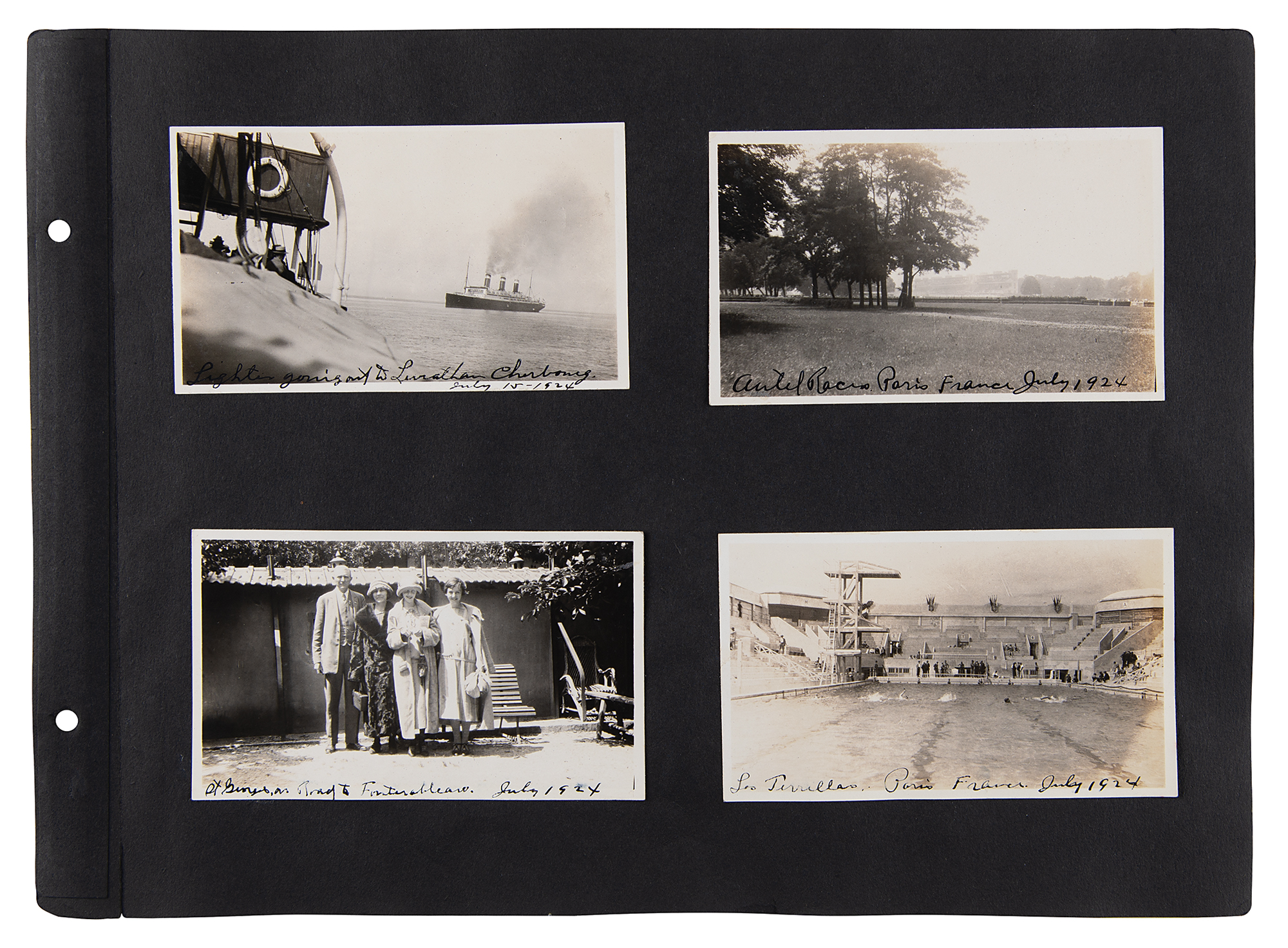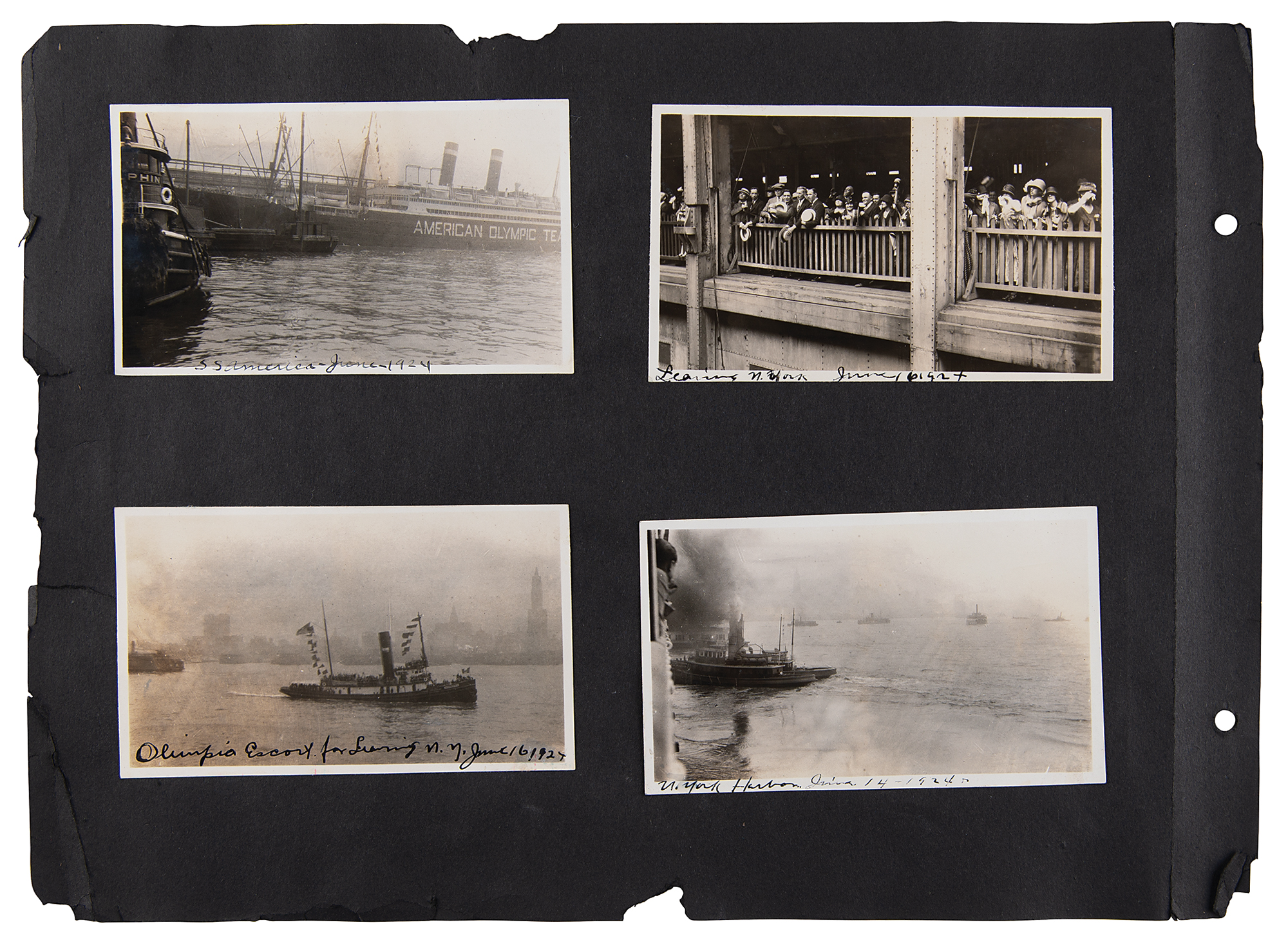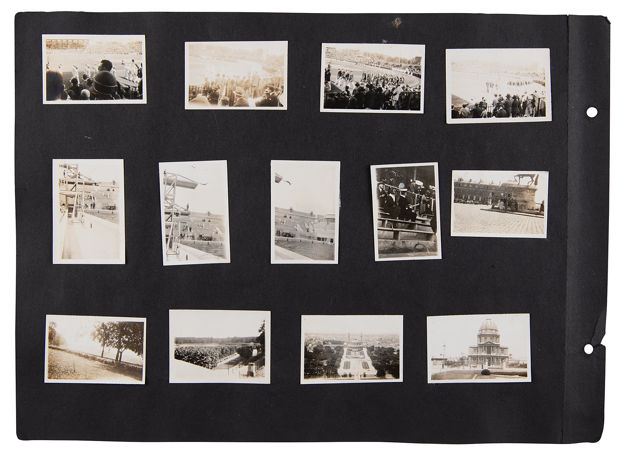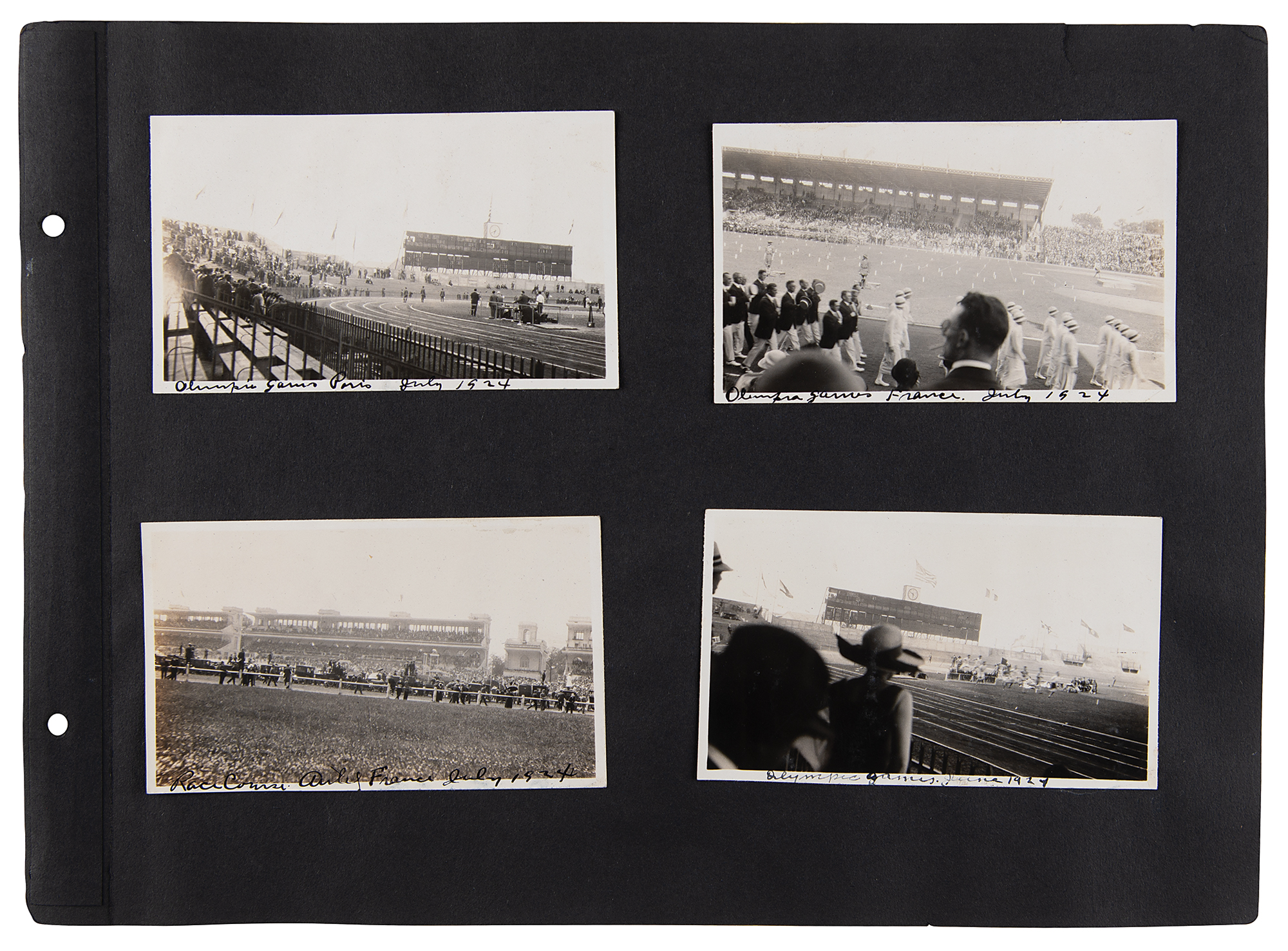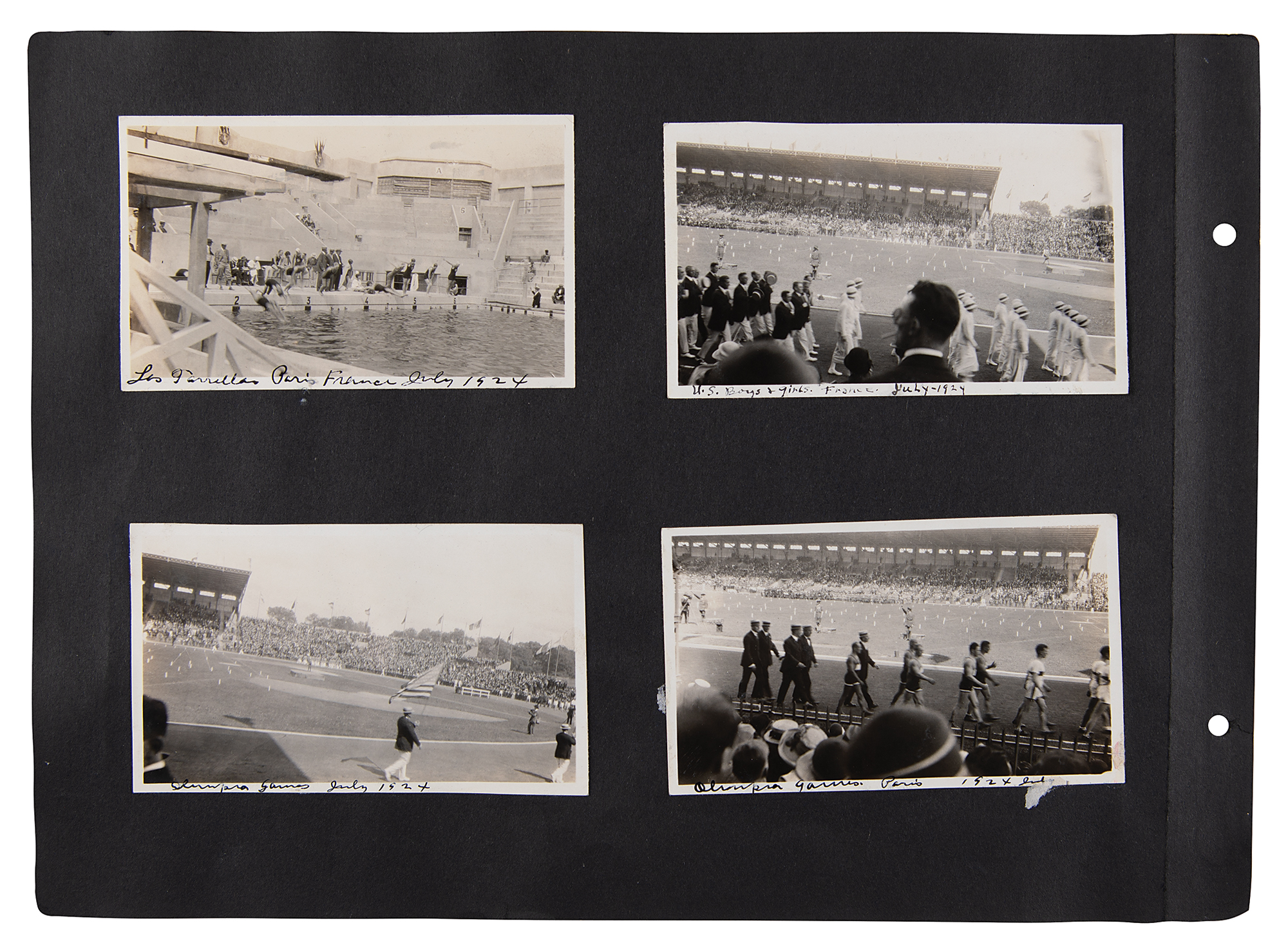 One-of-a-kind collection of 99 original photographs from the Paris 1924 Summer Olympics, chronicling the United States team's voyage over on the SS America and the athletes training and competing in Paris, plus some standard Parisian sight-seeing snapshots. The photos range in size from 2.5 x 1.5 to 5.5 x 3.5, and are affixed to both sides of eight black 15 x 11 photo album pages. Shots taken on the SS America include several group photos of the athletes and officials in the traveling party, as well as single portraits and smaller groups. Photos taken at the Olympic events include swimming and athletics, and a few subjects of the 'sight-seeing' photos are the Statue of Liberty, the Louvre, and the Arc de Triomphe, and various Paris street scenes. In overall fine condition. A unique, behind-the-scenes look at the 1924 American Olympic team. In fine condition.