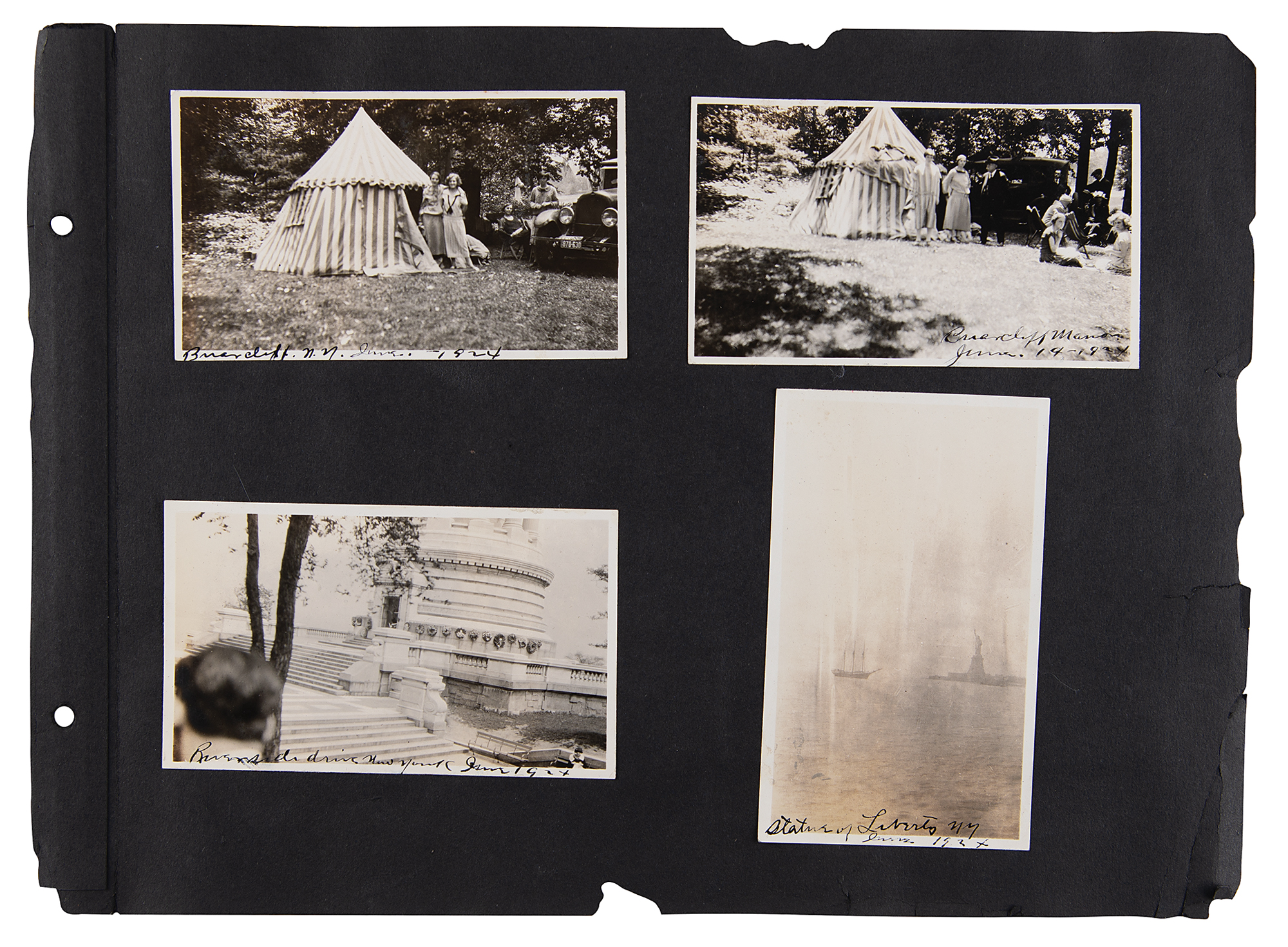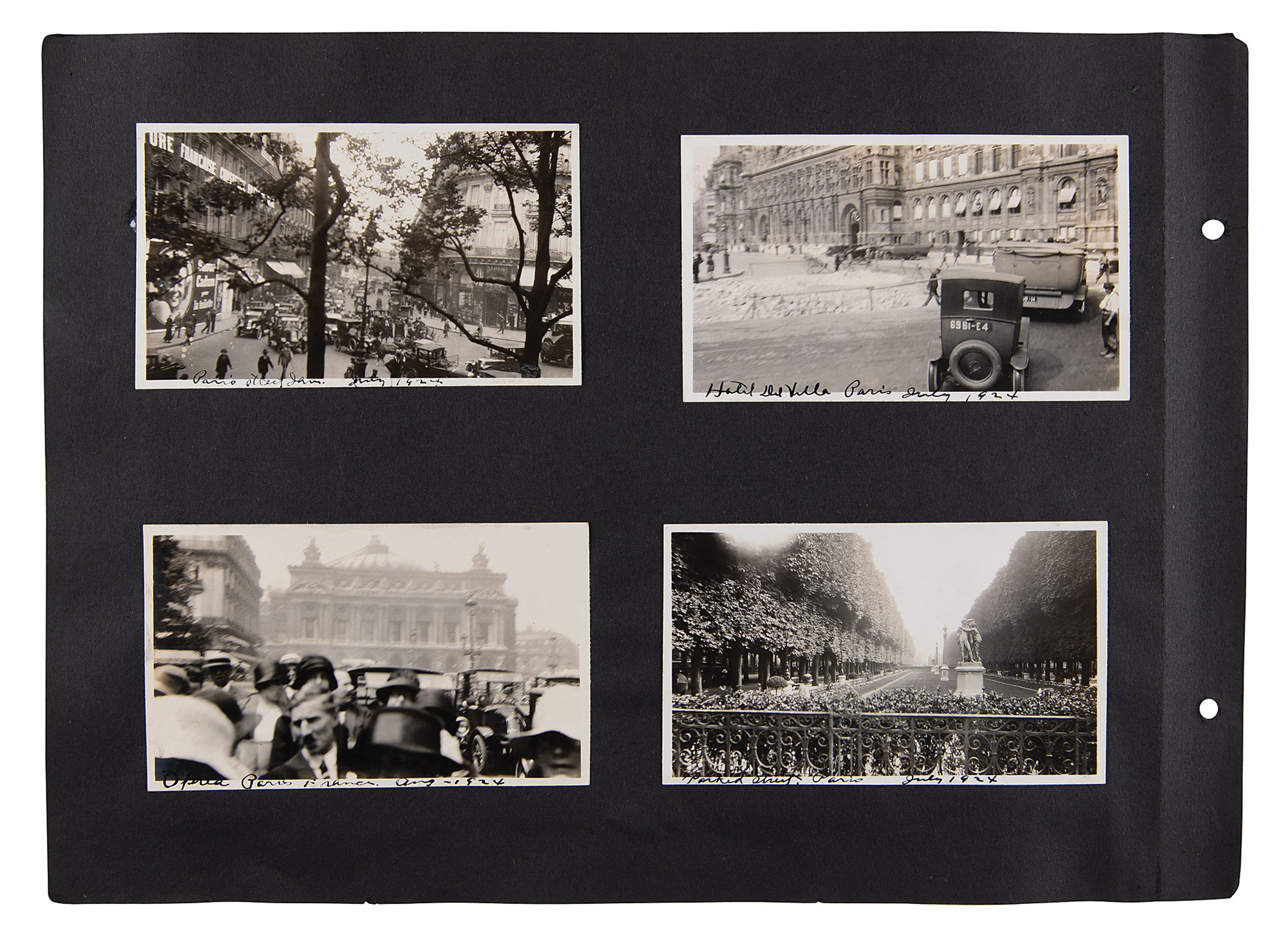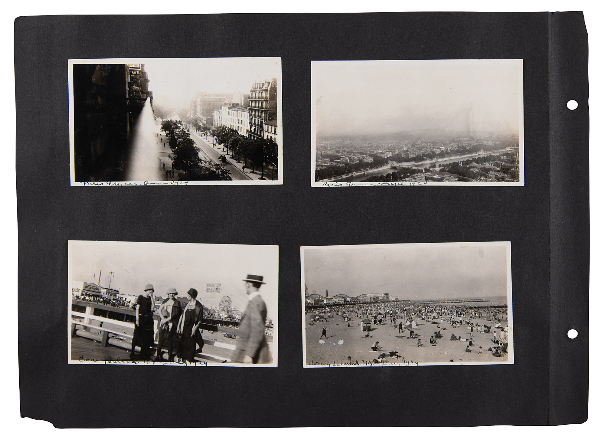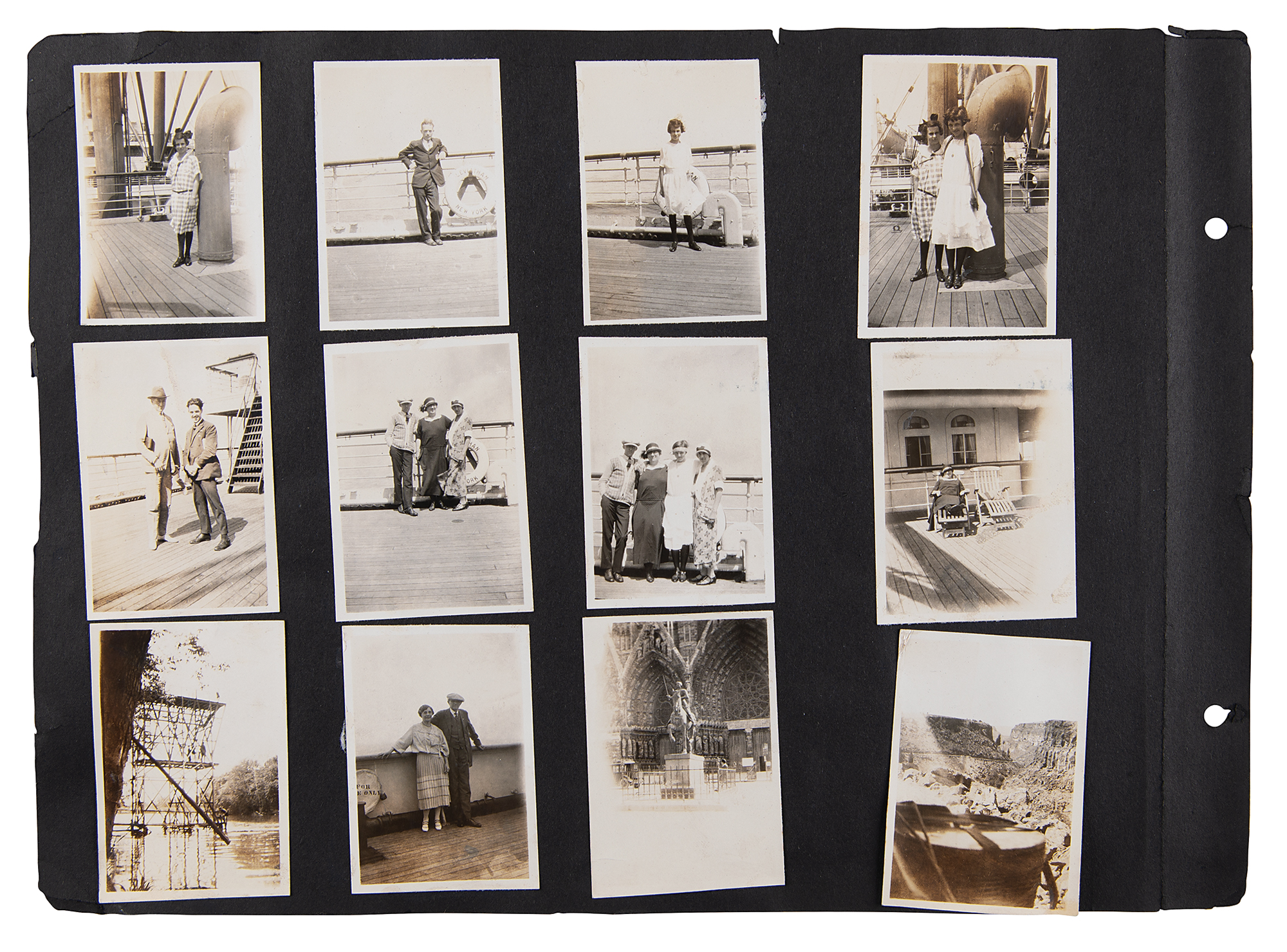 One-of-a-kind collection of 99 original photographs from the Paris 1924 Summer Olympics, chronicling the United States team's voyage over on the SS America and the athletes training and competing in Paris, plus some standard Parisian sight-seeing snapshots. The photos range in size from 2.5 x 1.5 to 5.5 x 3.5, and are affixed to both sides of eight black 15 x 11 photo album pages. Shots taken on the SS America include several group photos of the athletes and officials in the traveling party, as well as single portraits and smaller groups. Photos taken at the Olympic events include swimming and athletics, and a few subjects of the 'sight-seeing' photos are the Statue of Liberty, the Louvre, and the Arc de Triomphe, and various Paris street scenes. In overall fine condition. A unique, behind-the-scenes look at the 1924 American Olympic team. In fine condition.