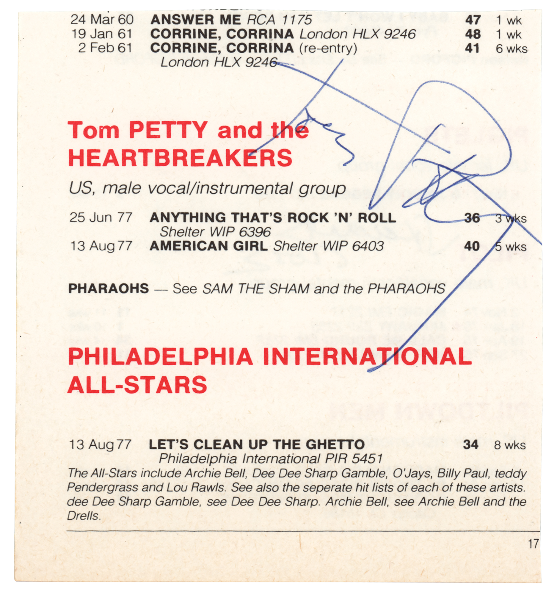 Ballpoint signature, “Tom Petty,” on an off-white 4 x 4.5 sheet clipped from a music advertisement listing two summer 1977 singles by Tom Petty and the Heartbreakers: ‘Anything That's Rock 'n' Roll’ and ‘American Girl.’ In fine condition. Accompanied by a certificate of authenticity from Tracks.