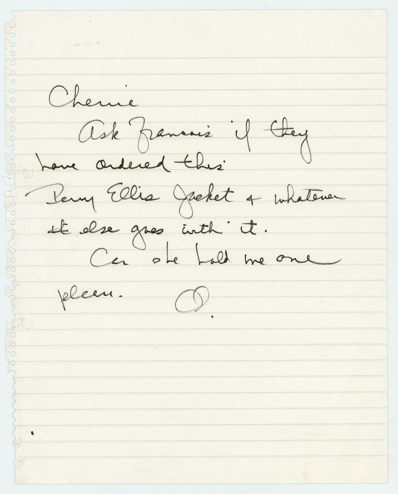 ALS from Olivia Harrison, the wife of George Harrison, signed “O.,” one page, 8 x 10, no date. Short handwritten letter to Cherrie, in full: “Ask Francis if they have ordered this. Perry Ellis jacket + whatever else goes with it. Can she hold me one please.” In fine condition, with some light creasing. Accompanied by a certificate of authenticity from Tracks.
