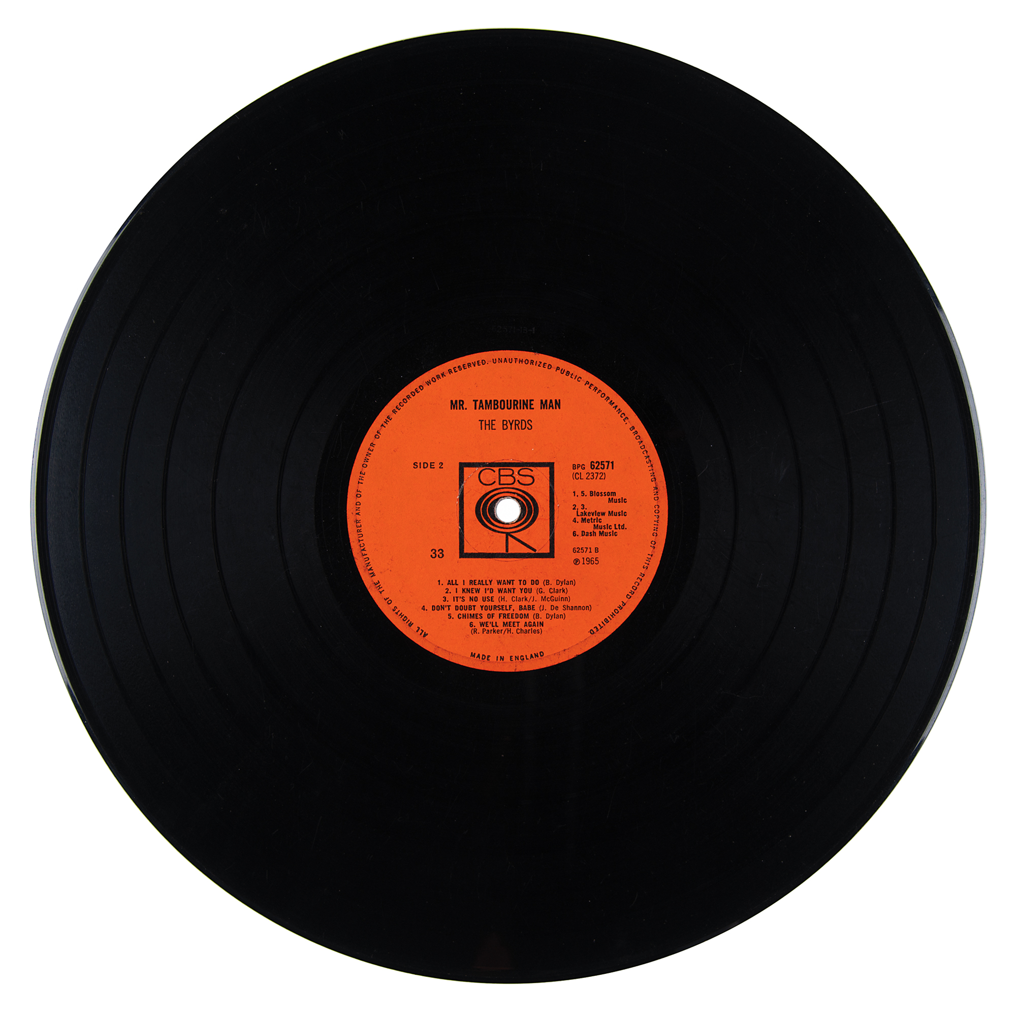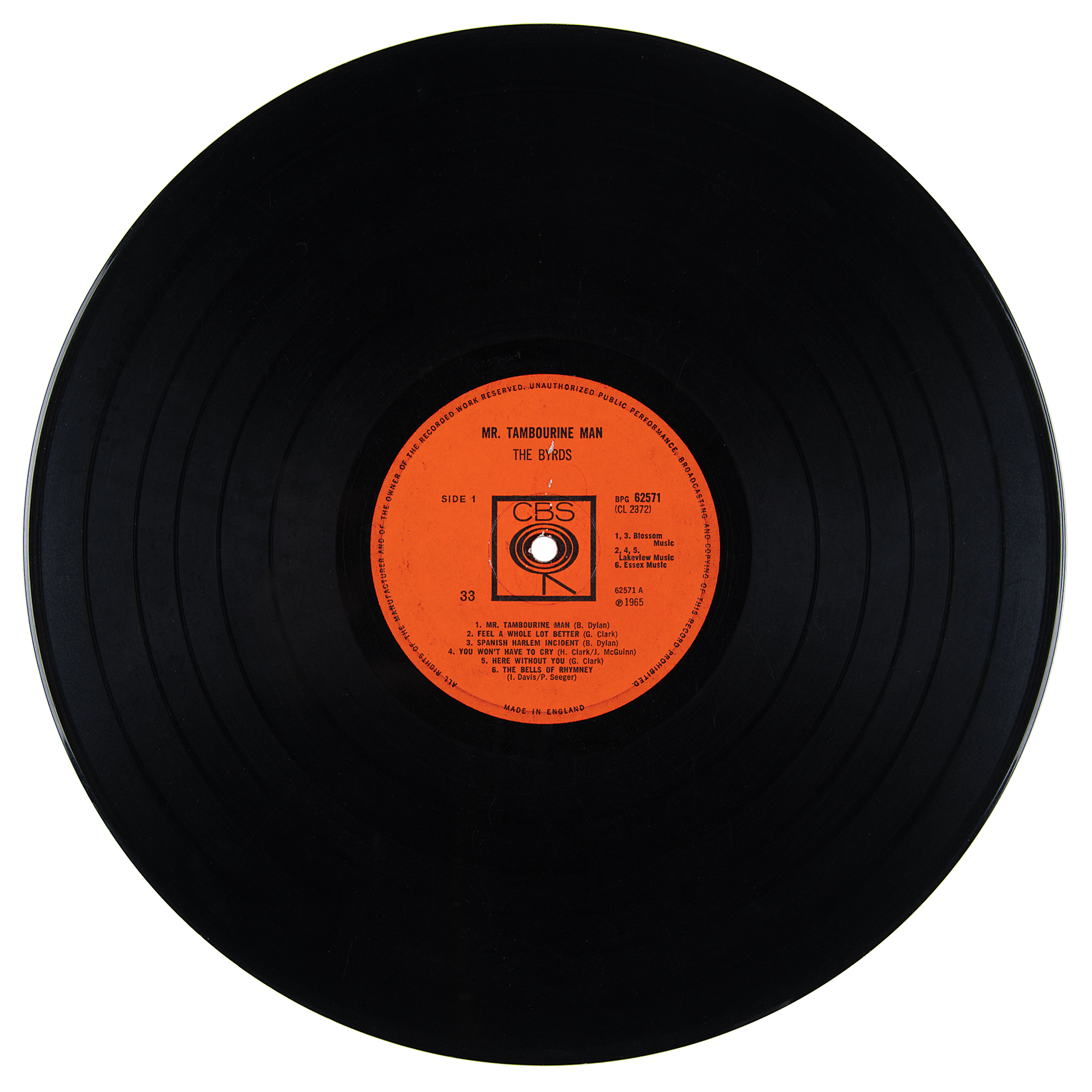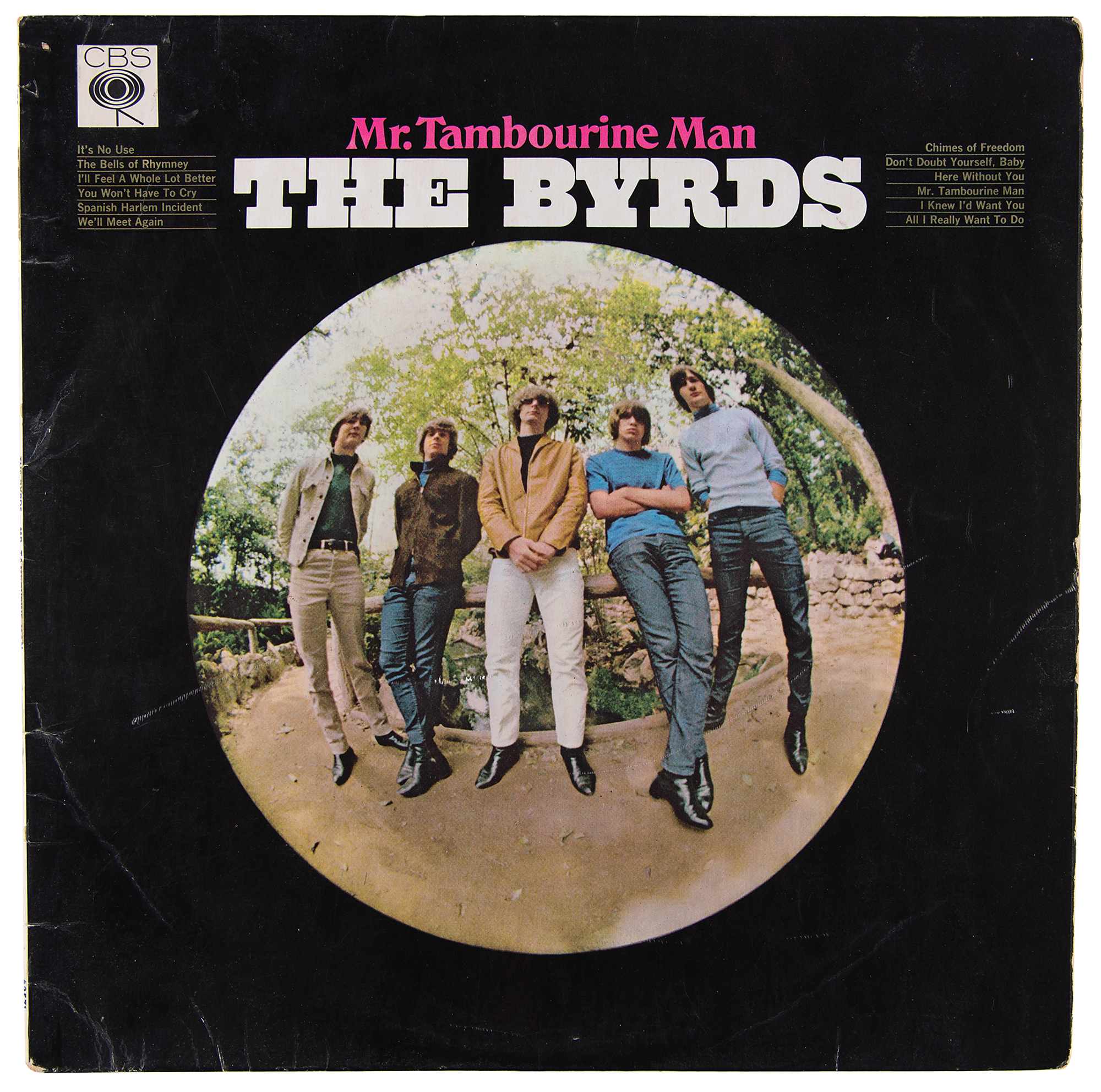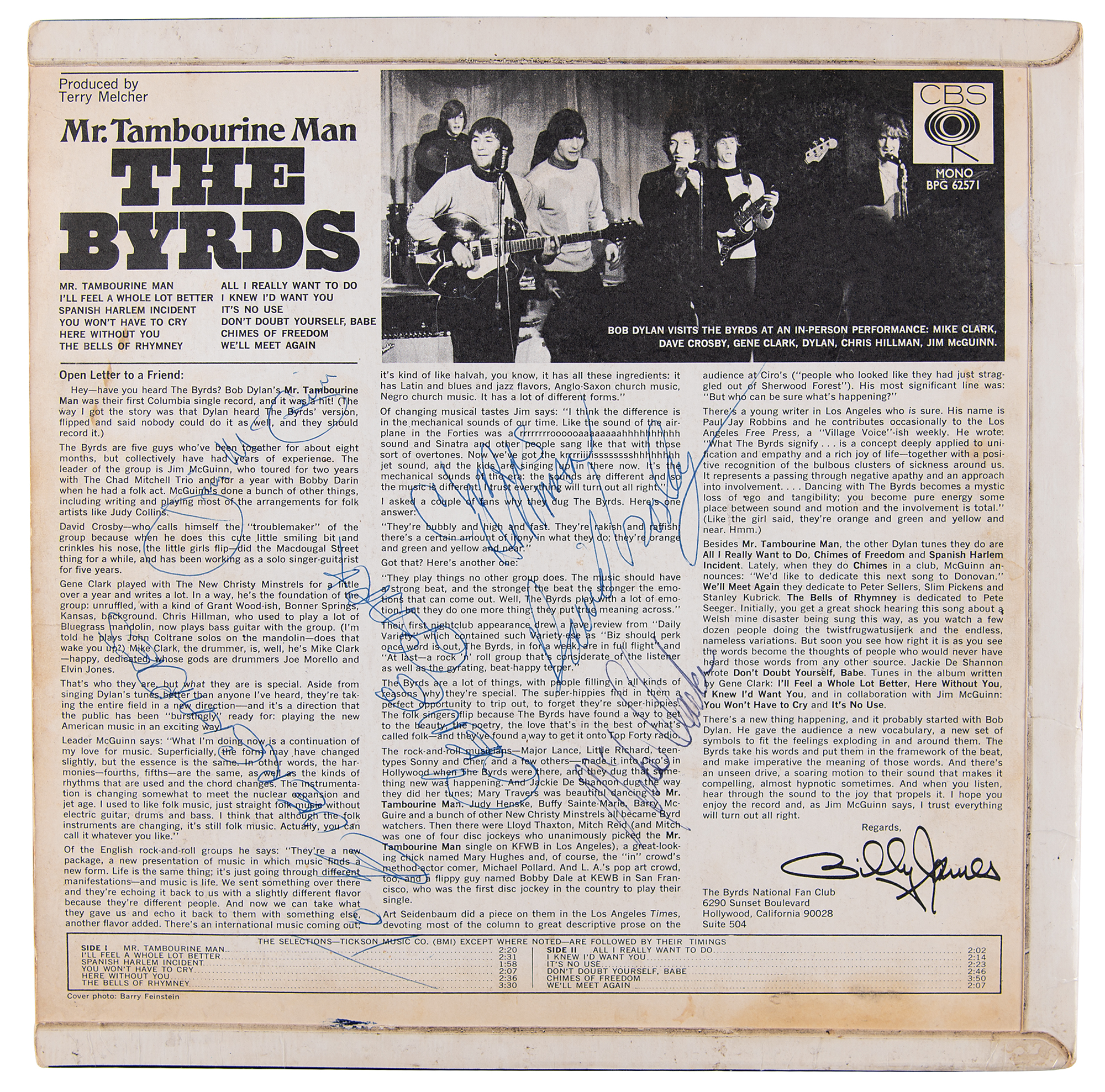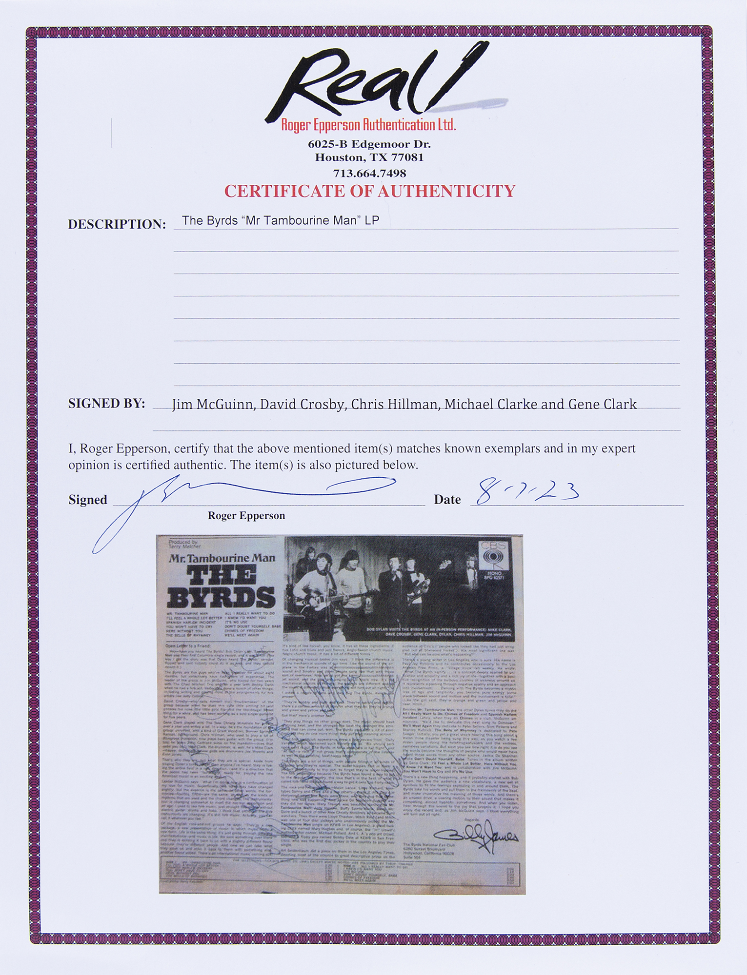 Mr. Tambourine Man album by The Byrds, signed on the back cover in ballpoint by Jim McGuinn, David Crosby, Chris Hillman, Michael Clarke, and Gene Clark, who adds the inscription "To Everglades." In very good to fine condition, with some light toning and soiling. The record is included. Accompanied by a certificate of authenticity from Tracks and a full letter of authenticity from REAL. Our first fully signed example of The Byrd's influential debut studio album, a record that represented the first effective American challenge to the chart dominance of the Beatles and other British Invasion bands during the mid-1960s.
