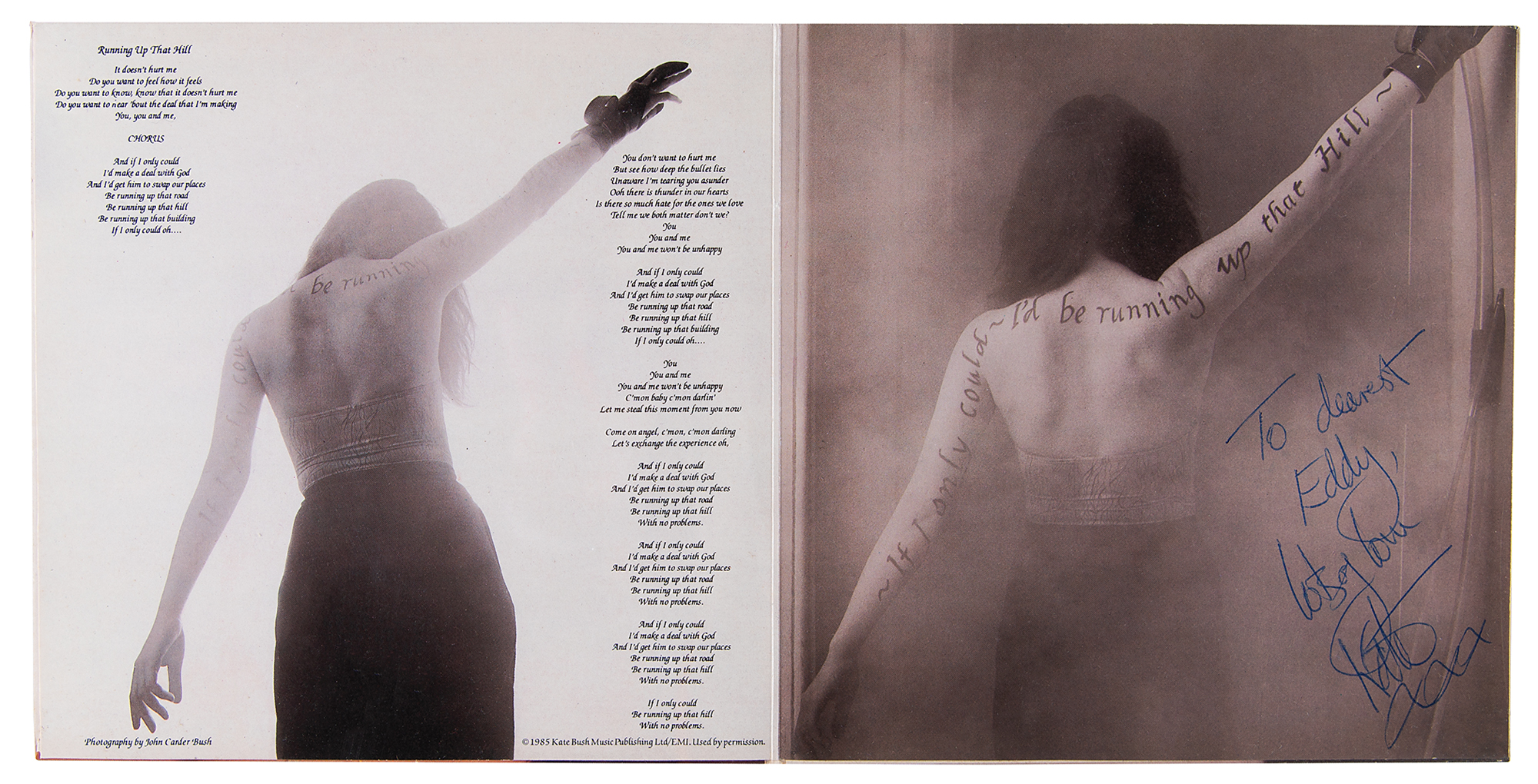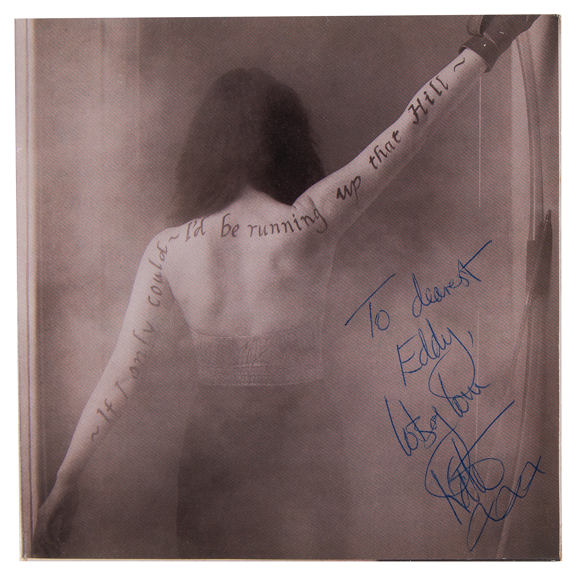 EMI Records 45 RPM single record for ‘Running Up That Hill / Under the Ivy’ by Kate Bush, signed and inscribed on the inner gatefold in blue ballpoint, “To dearest Eddy, lots of love, Kate, xxx.” In fine condition. Accompanied by a certificate of authenticity from Tracks.