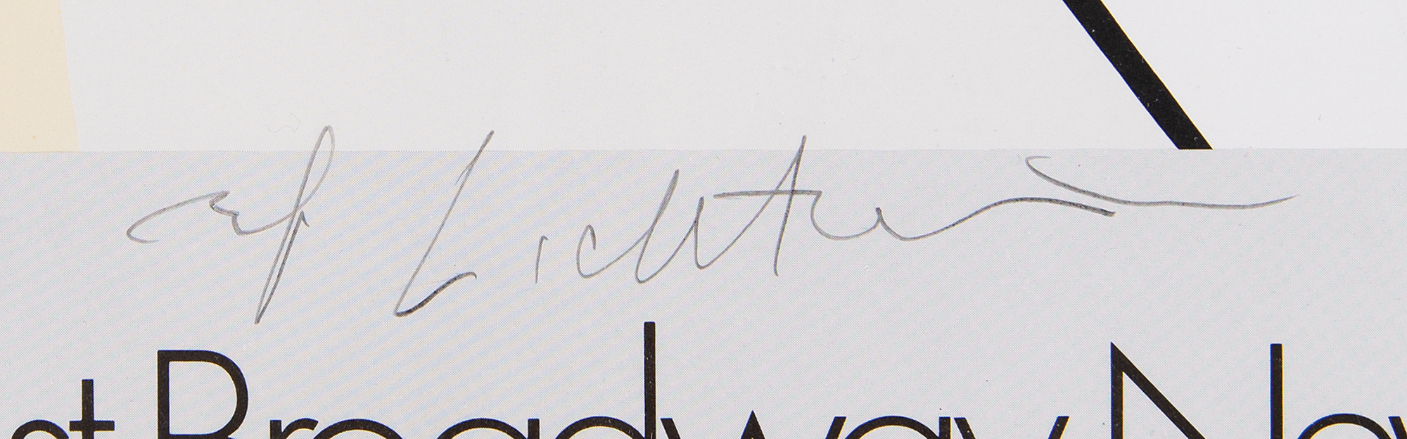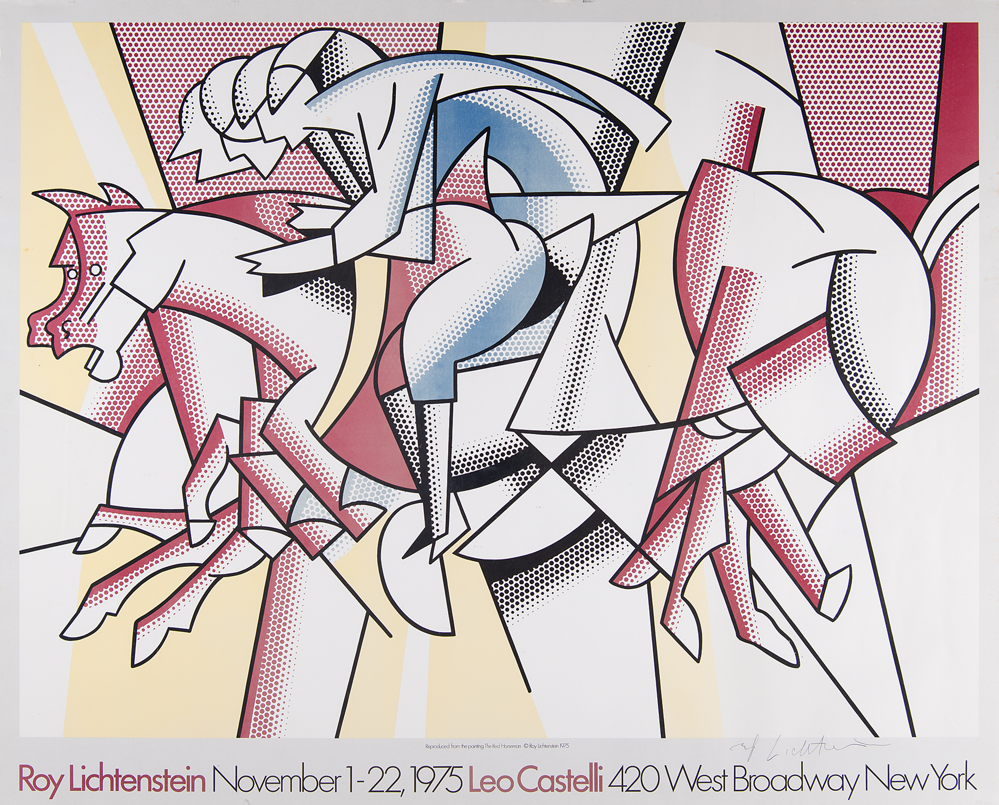 Color 28 x 22.5 poster for a Roy Lichtenstein exhibition at the Leo Castelli Gallery in New York, held November 1-22, 1975, featuring a reproduction of Lichtenstein's 1975 painting 'The Red Horseman,' signed in the lower right in pencil by Lichtenstein. Rolled and in fine condition, with trivial edgewear.