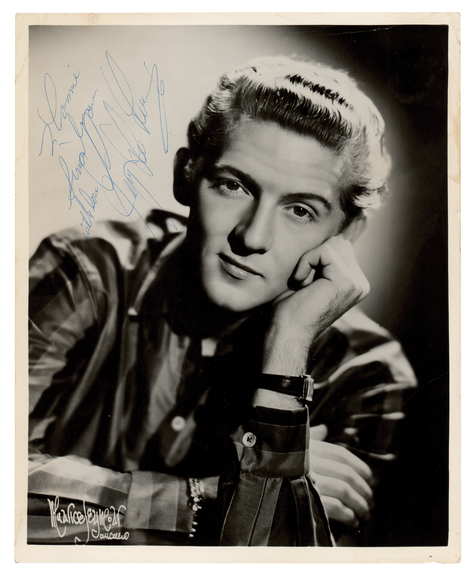 Vintage glossy 8.25 x 10 publicity photo of Lewis by the Maurice Seymour Studio, signed and inscribed in blue ballpoint, "To Connie, Sincerely yours, with love, Jerry Lee Lewis.” In very good condition, with creasing and emulsion irregularity, primarily to the perimeter.