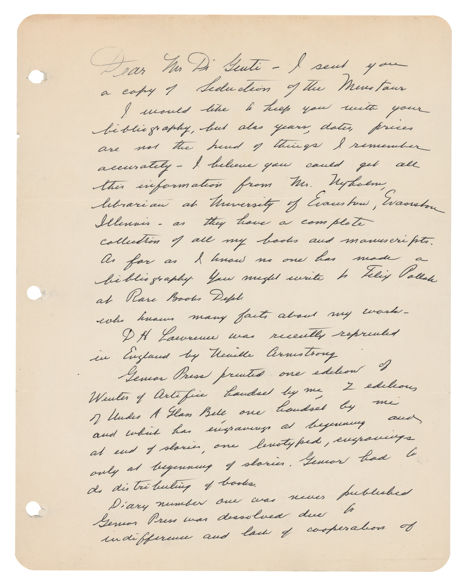 ALS, two pages, 8.5 x 11, November 30, 1961. Handwritten letter to Thomas Digenti, in full: “I sent you a copy of Seduction of the Minotaur. I would like to help you with your bibliography, but alas years, dates, prices are not the kind of things I remember accurately — I believe you could get all this information from Mr. Nyholm, librarian at University of Evanston, Evanston, Illinois, as they have a complete collection of all my books and manuscripts. As far as I know no one has made a bibliography. You might write to Felix Pollak at Rare Books Dept. who knows many facts about my works.