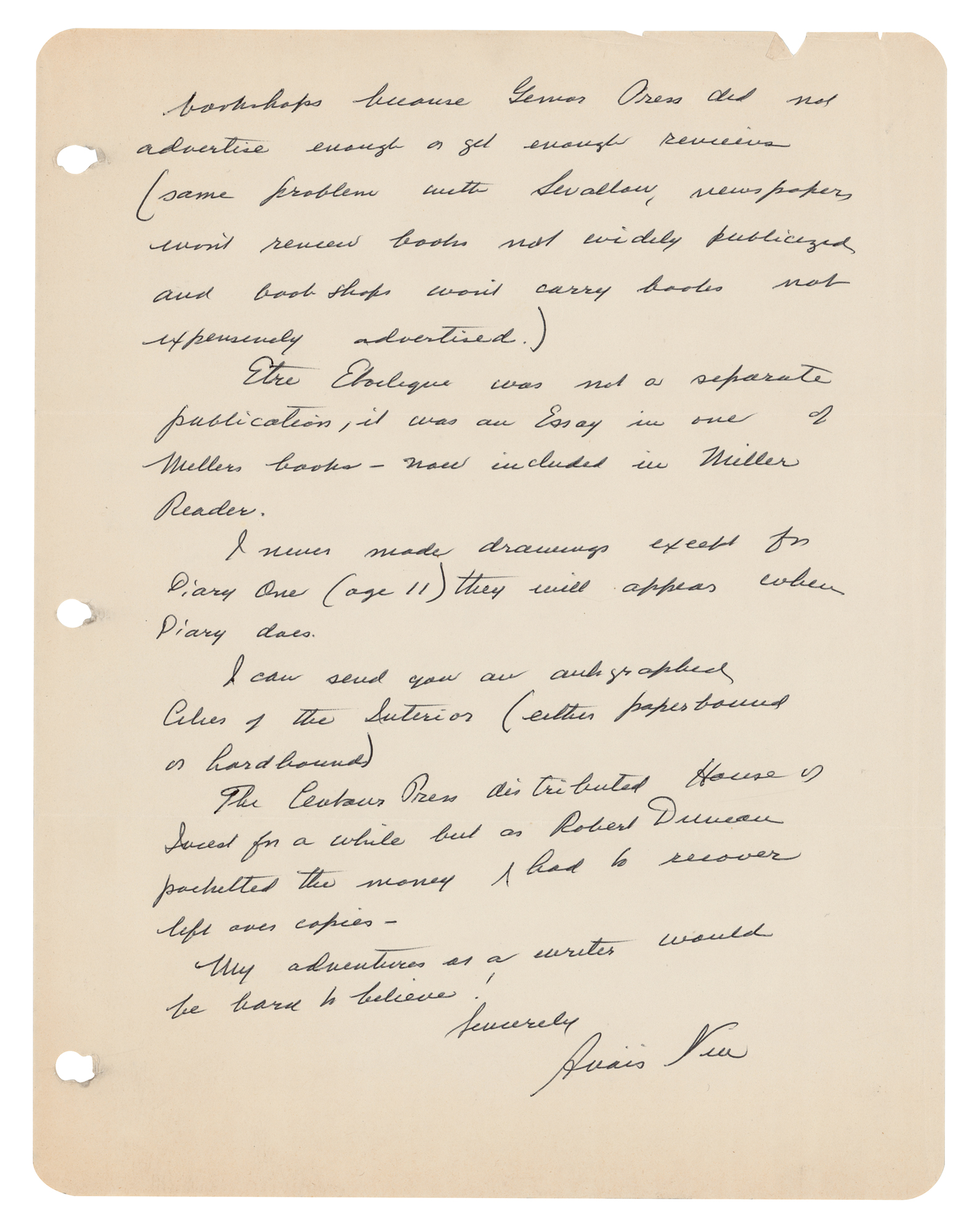 My adventures as a writer would be hard to believe!” In fine condition, with three files to the left edge. Accompanied by the original hand-addressed mailing envelope. Nin came to the attention of American readers when Henry Miller wrote a word portrait of her called 'Un Etre Etoilique' ('A Luminous Being').